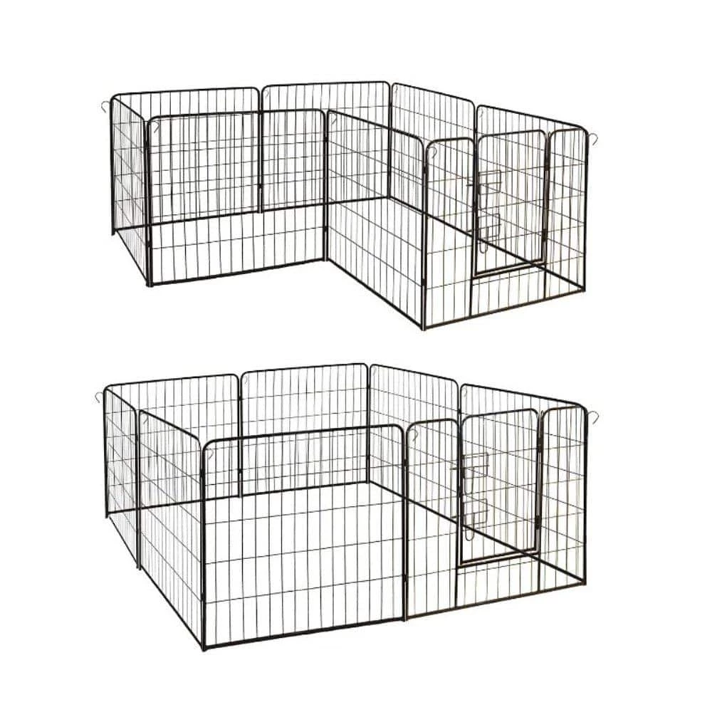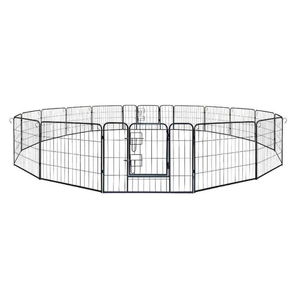 This Aleko kennel playpen is a must have for your pet. Easy to set up in variety of ways, perfect for both indoor and outdoor use. Quality construction with simple assembly instructions will set up in minutes. Pens are made up of 16 individual sides or panels, each measuring 32 in. x 24 in. These panels can be setup in multiple configurations or shapes. Multiple pens of the same size may also be connected together to further increase the total pen size and or configure additional shapes. Can be used for training, as a kennel or for other purposes. Pens feature an entry or exit door for convenience when feeding and training. The door closes easily and locks with the a slide-bolt latch.