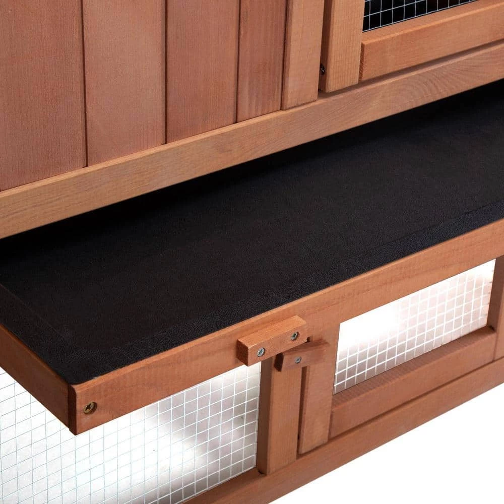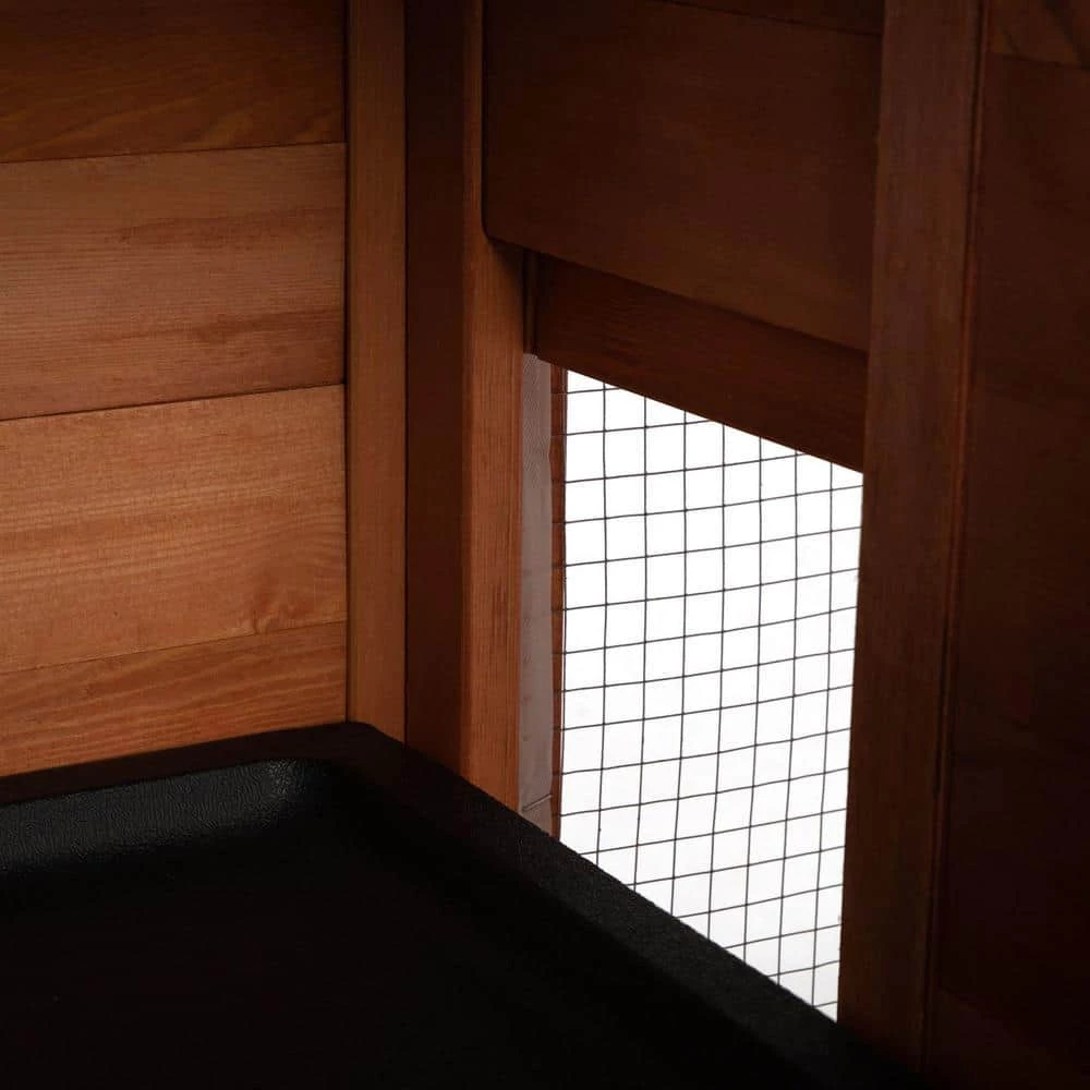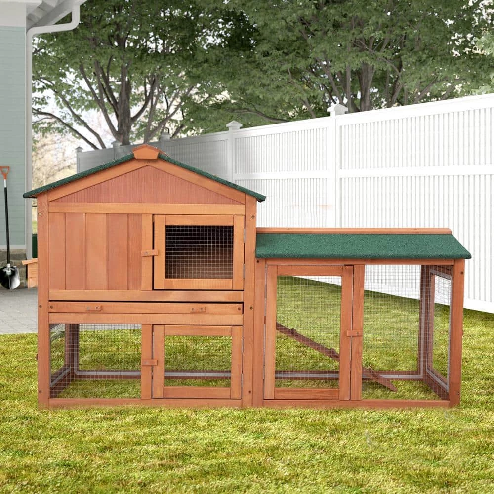 This wooden outdoor rabbit cage provides an ideal place for your furry friends to live freely and safely. This rustic 2-storey pet house is equipped with an elevated main house and a spacious running track, connected by a stable beam ramp. Let your cute rabbits, chickens, mice and other small pets roam indoors and outdoors, upstairs and downstairs, in the sun or in the shade, for the best comfort.