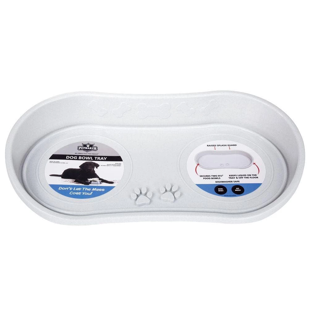 Avoid a mess of food and water with the Non Skid Pet Bowl Tray by Petmaker! The tray has raised sides to help prevent splashes; keeping liquid and food on the tray and water off the floor. A non skid texture is added to the bottom to prevent the bowl from moving around on hard floors. Raised circular edges are built into the tray to secure two 8-1/2″ food/water bowls. A neutral color matches any decor. Dishwasher Safe. Don’t worry about mess on your floor with the Non Skid Pet Bowl Tray by Petmaker!