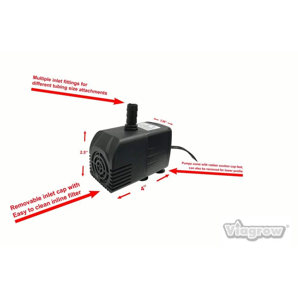 Viagrow Submersible Water Pumps are an excellent choice for use in aquariums, hydroponic gardening, aquaponics, statuary and pond installations, and more. Well-constructed and extremely durable. These pumps come with a 1 year satisfaction guarantee.