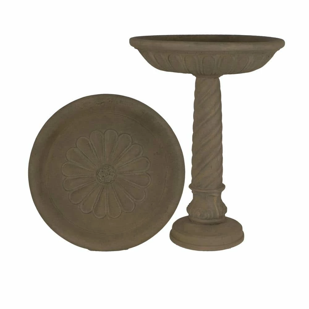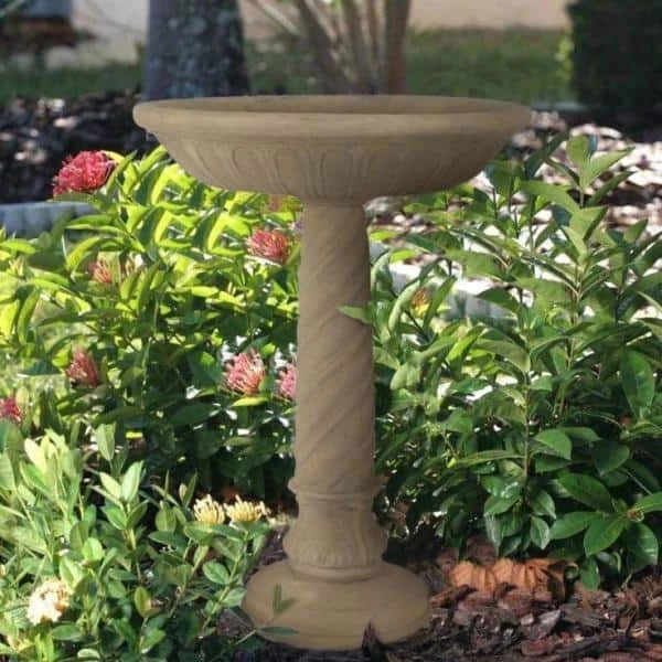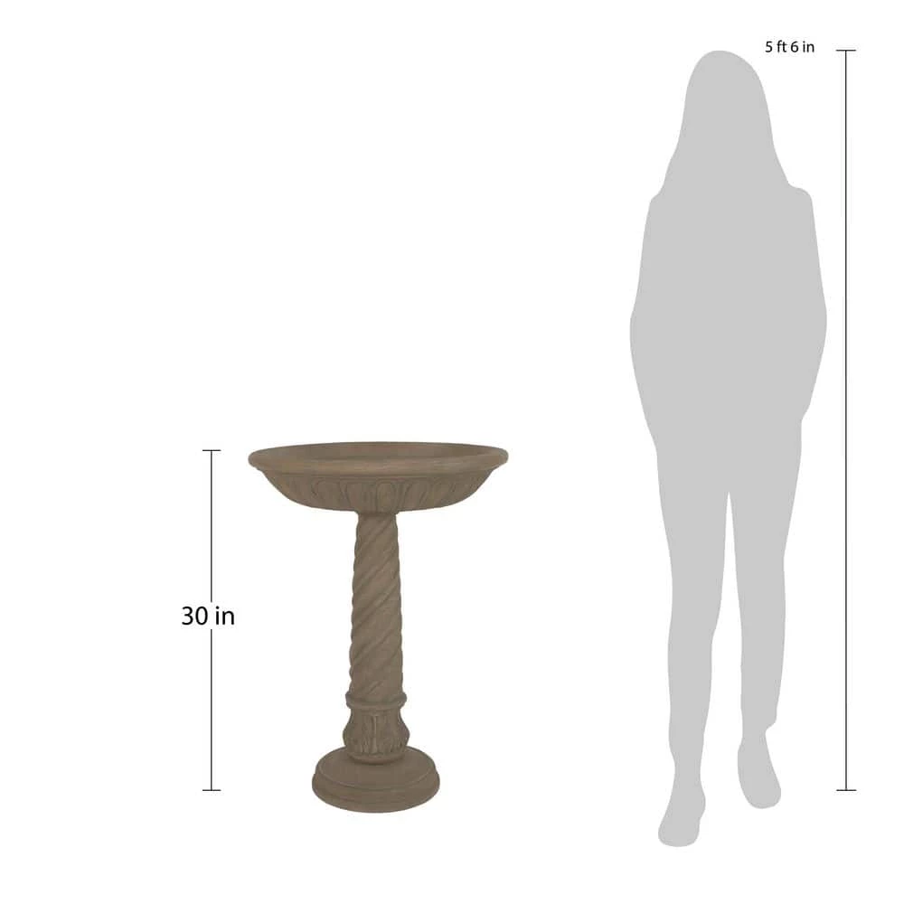 This exclusive, handcrafted deep bowl birdbath with swirl base allows you to pause and enjoy your feathered friends in your own garden. Constructed of a blend of natural stone, resin and fiberglass, the birdbath is lightweight, weather resistant and easy to assemble. The 85% crushed natural outer stone surface ages to a beautiful time-worn hue as it weathers.