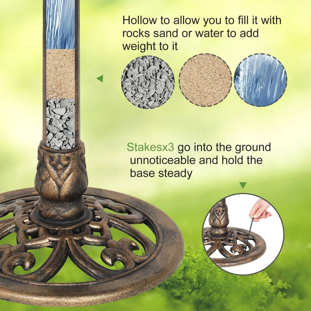 - Sturdy base – this birdbath stays in place perfectly by filling the hollow stand with sand, rocks or water to add weight to it, there are also stakes included which go into the ground unnoticeable and hold the base steady