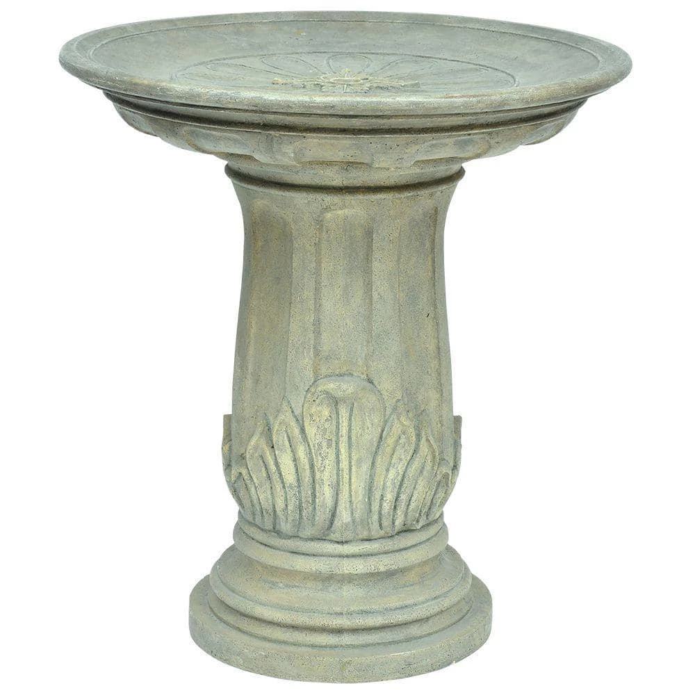 This exclusive, handcrafted deep bowl Birdbath with Royal Leaf base will give you hours of enjoyment watching your feathered friends in your own garden. Constructed of a blend of natural stone, resin and fiberglass; Birdbath is lightweight, weather resistant and easy to assemble. The 85% crushed natural outer stone surface ages to a beautiful time worn hue as it weathers.