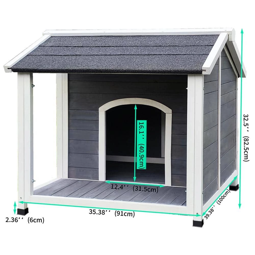 Dimension of this dog house is 35.83 in. W x 39.38 in. D x 32.50 in. H. This style raised dog house is a fun and rustic addition to your backyard, patio, garden or inside house. It can match the color and architectural style of your house. Designed with porch and 1 separate living rooms. Perfect for your pet dog to have a nice living place.