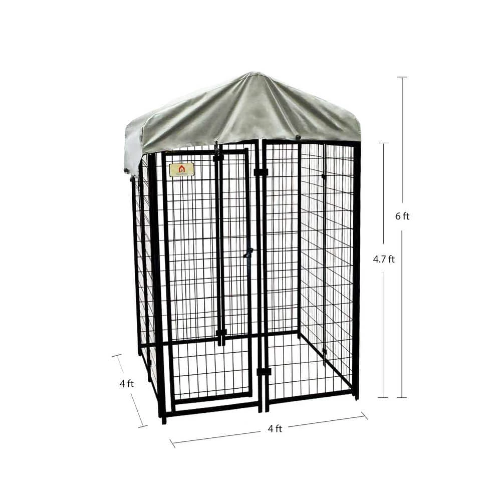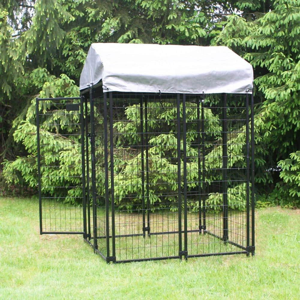 The KennelMaster 4 ft. x 4 ft. x 6 ft. kennel takes the complication out of assembling and installing an animal enclosure. Constructed of sturdy 12-gauge wire, this kennel is built to handle climbing, chewing, digging, and clawing. This solid steel kennel keeps your pet safe, while the waterproof cover provides shade from direct sunlight and shelter from rain. The vinyl-coated finish resists rusting and prolongs the life of your kennel, in addition to offering a sleek, finished look. It is very easy to assemble this kennel, and no tools are required. Also available in two larger sizes: Medium 6 ft. x 4 ft. x 6 ft. model and large 8 ft. x 4 ft x 6 ft. model.