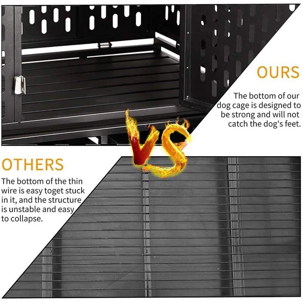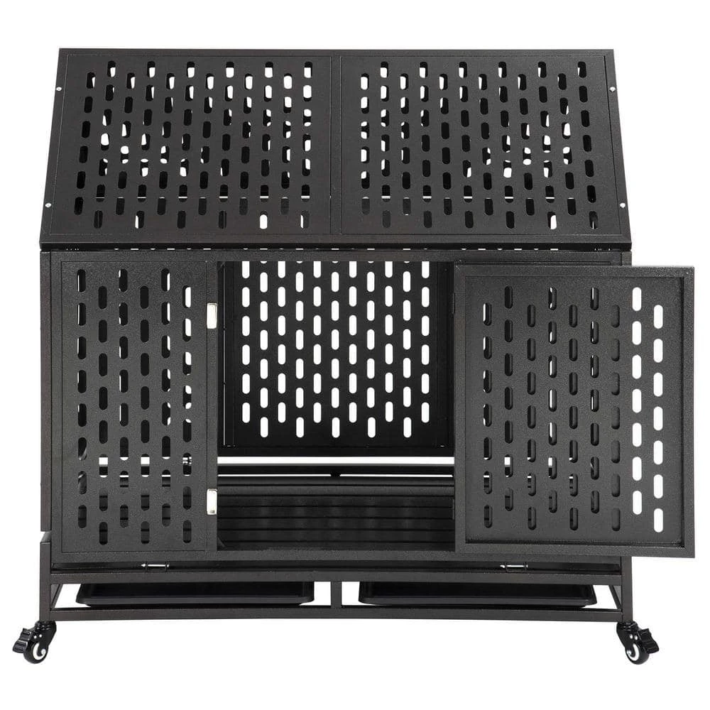 The dimensions of this pet dog cage is 44.5 in. L x 29.5 in. W x 43.3 in. H. Made from corrosion-resistant steel,strong and durable, hard to be damaged,nontoxic finished surface keep your dog health,And render excellent anti-rust ability, suitable for most medium and large dogs,two locks with the safety buckles to prevent the dogs from opening the door and escaping.It has very heavy duty frame.