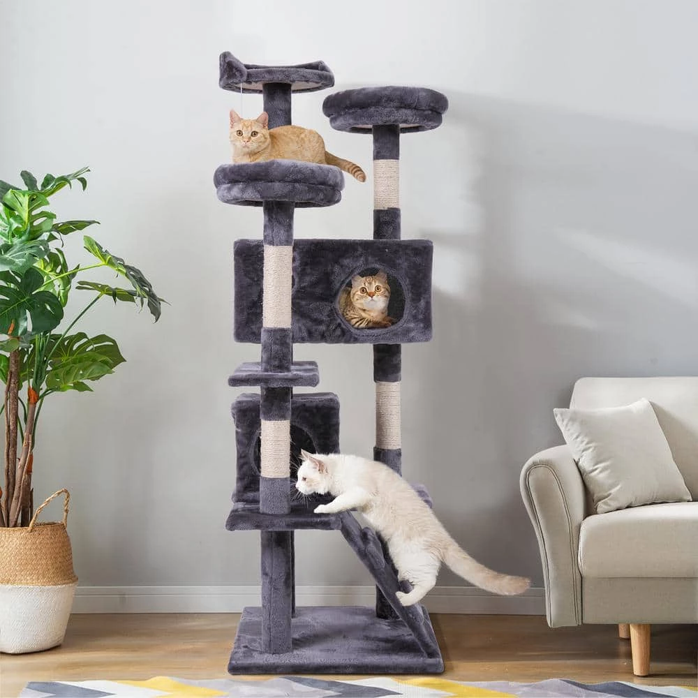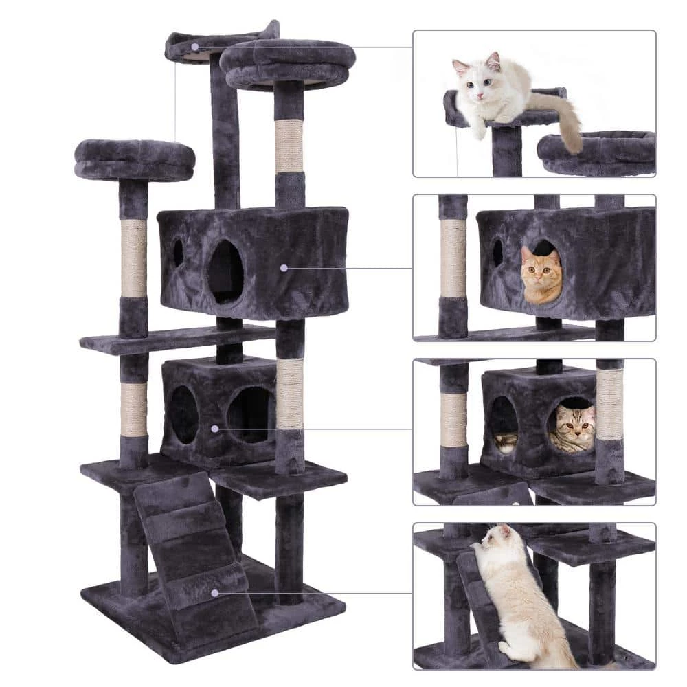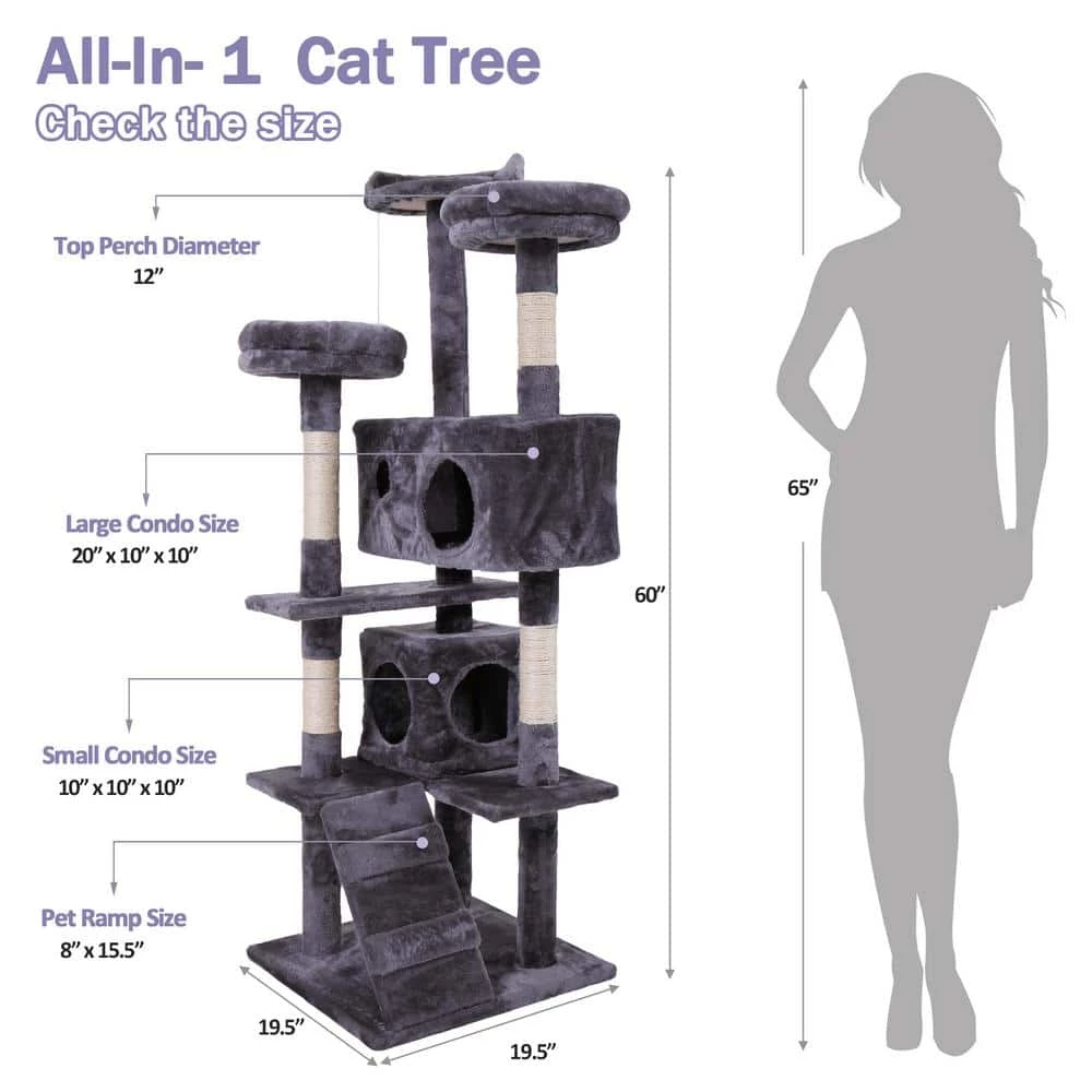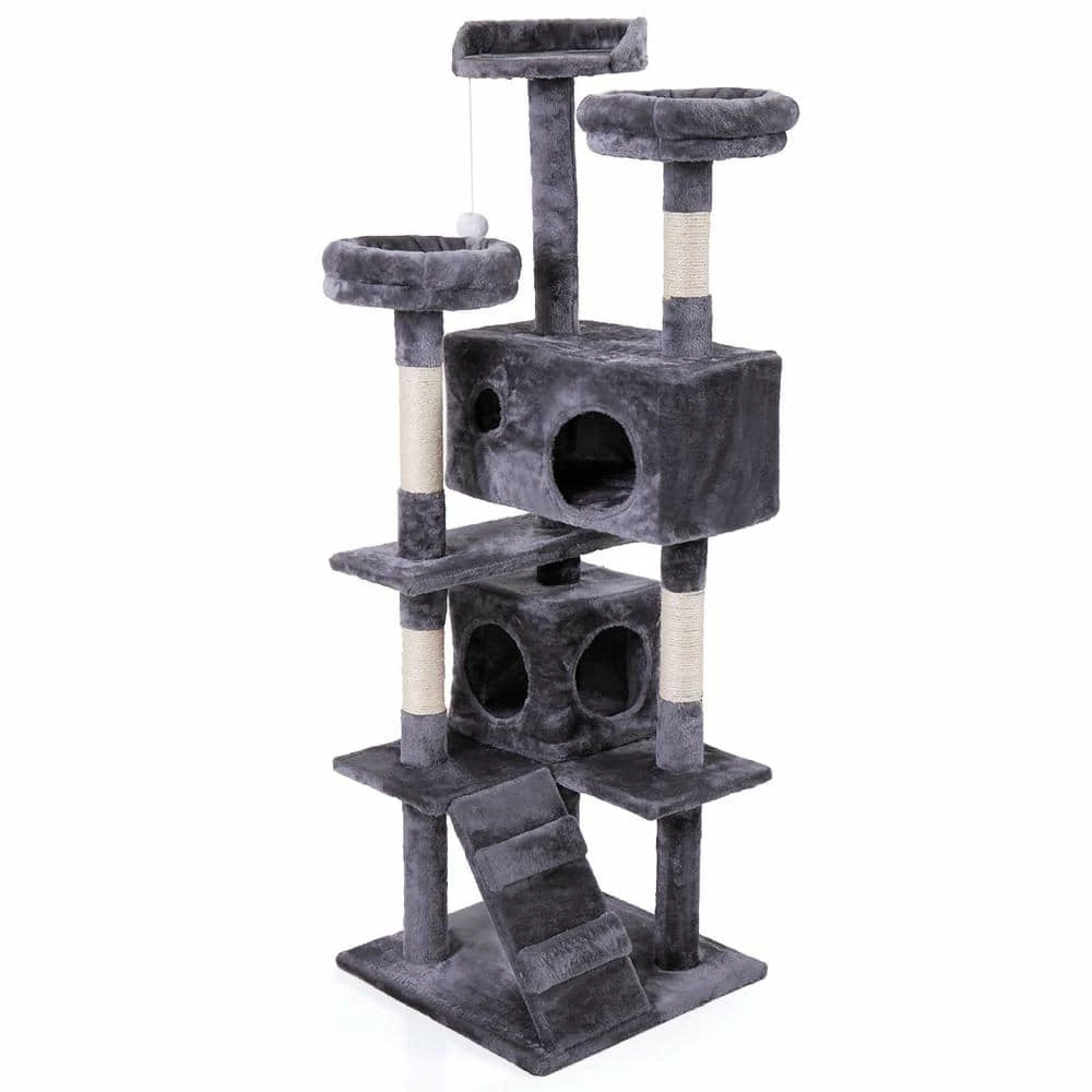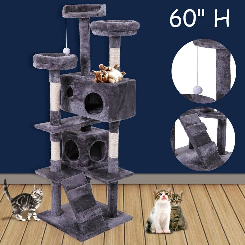 If you’re in the market for a cozy condo for your feline friend, this COZIWOW 60 in. Multi-Level Cat Tree Tower with safe scratching posts is exactly what you’re looking for. Featuring an interactive hanging ball, 2 warm condo retreats, and 3 comfortable perches, the kitten climbing tower provides your small to medium cats with endless playing and relaxing fun. Made from premium particleboard with soft and skin-friendly flannel covering, the modern cat house will encourage your kitties to curl up on their own palace rather than bother your valuable furniture.