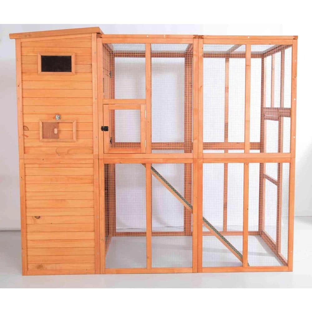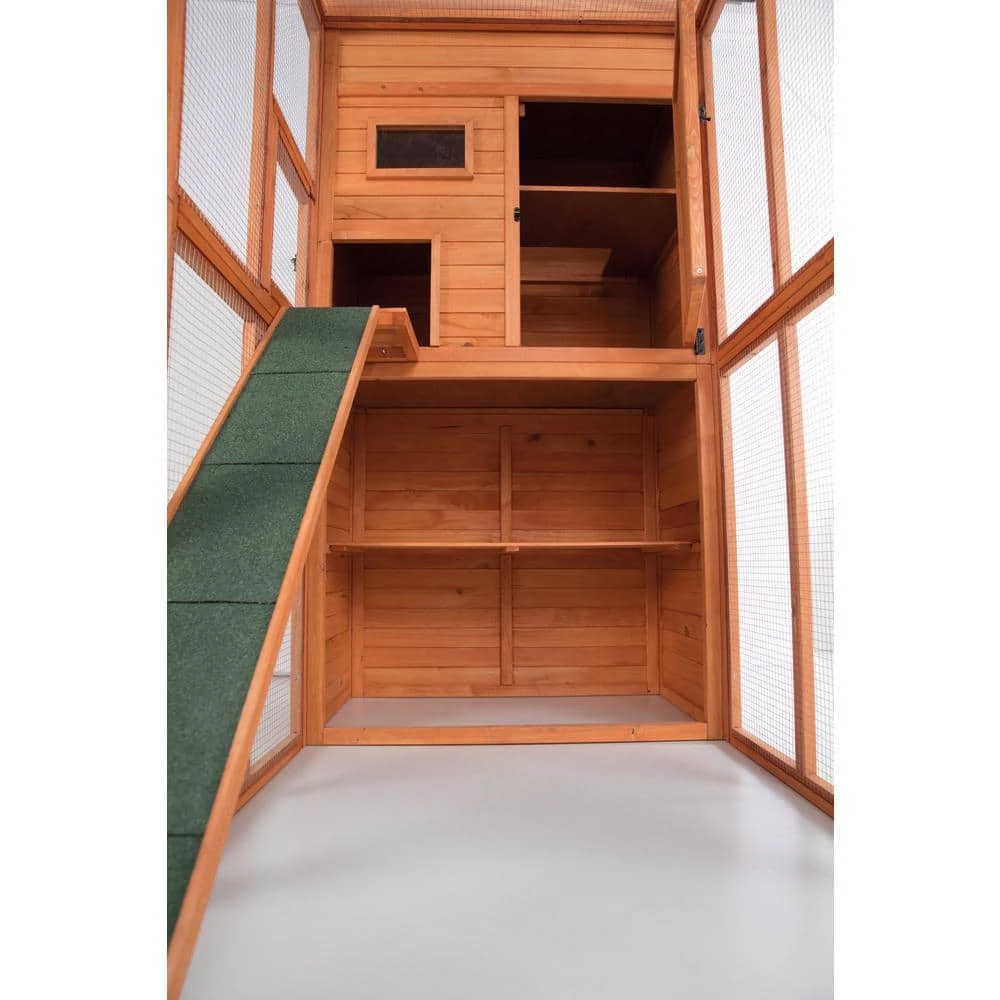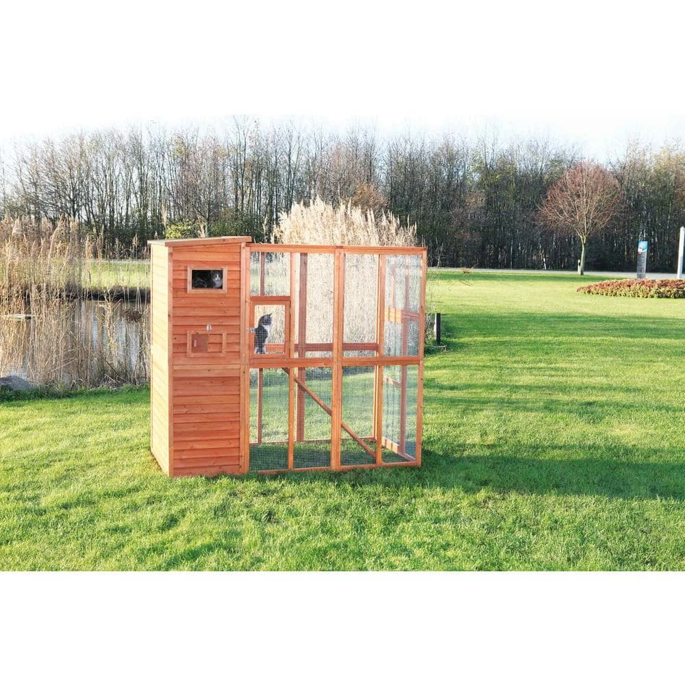 TRIXIE’s Wooden Outdoor Cat Run is a unique solution to protecting and housing your cats when outdoors. Ideal for multiple cats, the two-story design has a retreat on the upper level. The ramp allows your pet to roam freely inside and outside, upstairs and downstairs, in the sun or shade for ideal comfort. We’ve also included a window with pane and a slide door on the retreat’s exterior, as well as a small side door with latch for easy access to your pet. Wood paneling at the back and side offer additional protection from the elements. We’ve even included a large front door with metal latch for security.