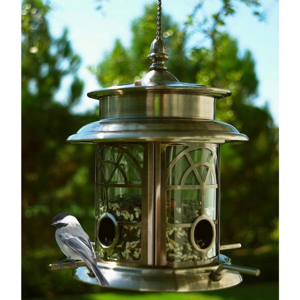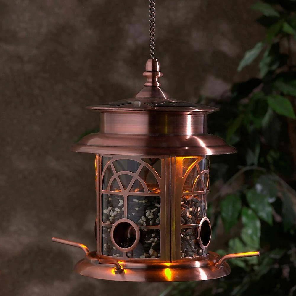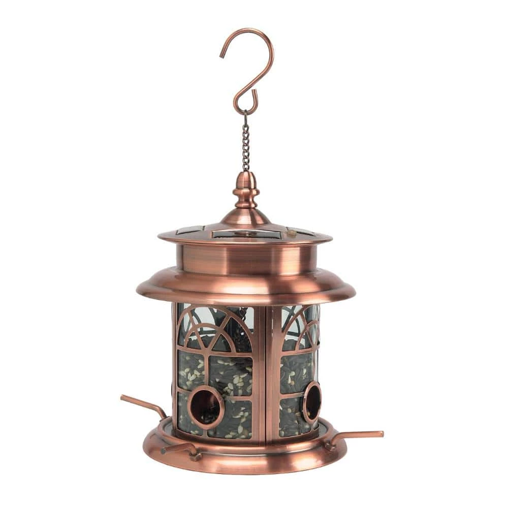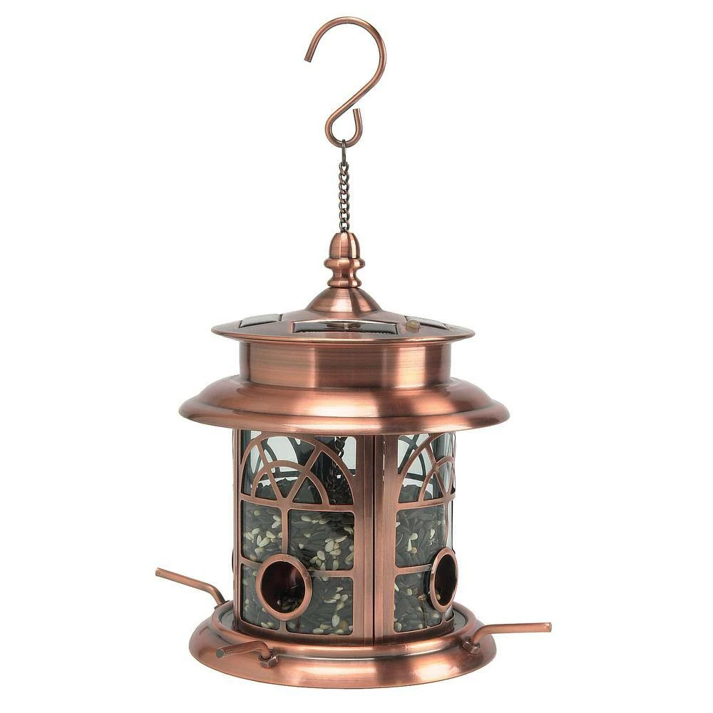 The Arch Inlay Solar Lighted Birdfeeder provides a warm Amber glow from the 3 LED’s around the rim. This patented solar birdfeeder features aluminum construction with durable Pewter or Copper finish, and clear glass panes. Holds up to 1.75 lbs. of seed mix for your feathered friends to enjoy.