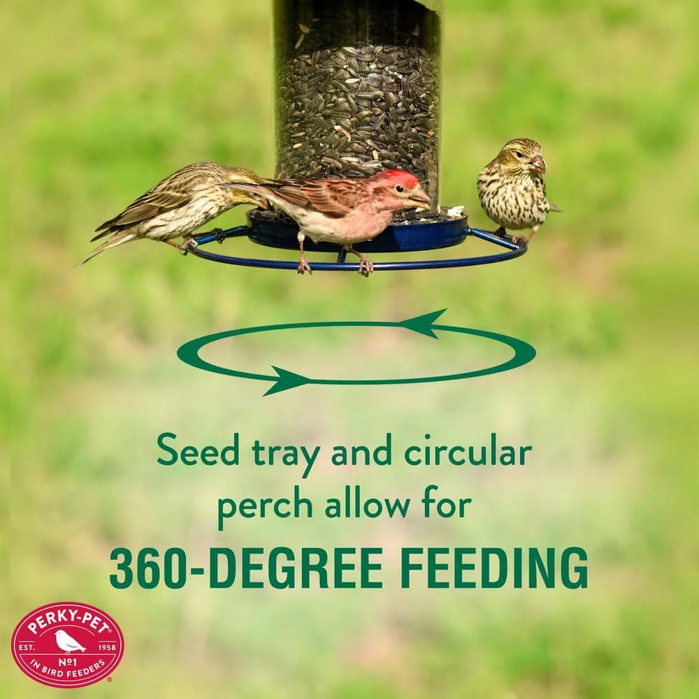 The Perky-Pet Blue Sparkle Panorama Feeder features an eye catching blue sparkle finish with a convenient circular perch. This panorama bird feeder holds up to 2 lb. of seed, has a feeding tray, and a sparkling blue powder coated finish. The Sure-Lock cap system helps keeps squirrels out, yet allows birds to feed. This feeder is easy to fill and clean and will make a stunning addition to any backyard, porch or bird feeding retreat. The transparent seed compartment makes it easy for you to monitor seed levels and keep your bird feeder clean. Remember to clean your bird feeder once every two weeks with a mild soap and water solution.