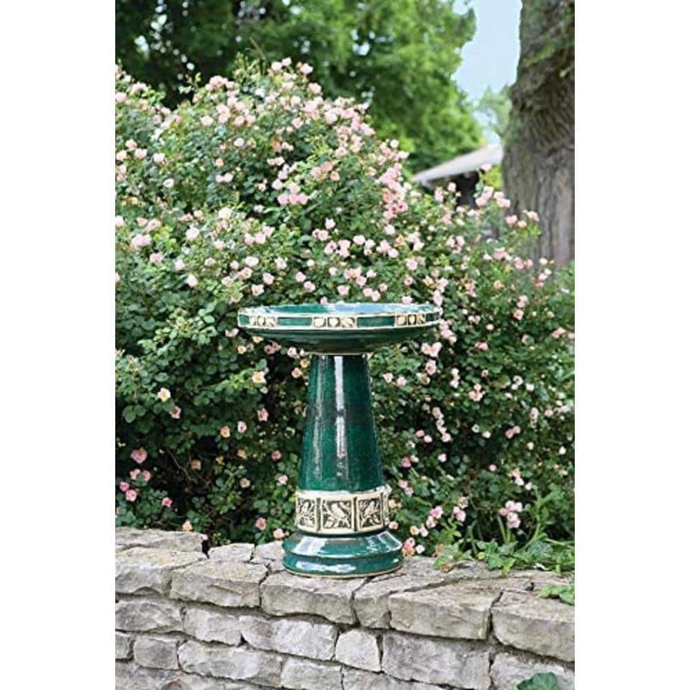 - With beautiful, deep green glaze and hand painted bird detailing, this bird bath pedestal creates an elegant focal point in your yard or garden