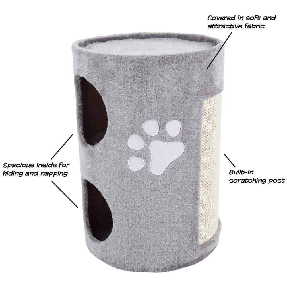 The PETMAKER 2 story Cat Condo with scratching surface is covered with soft plush fabric and provides 3 comfortable places for your cats to rest and play. The attractive condo provides 2 spacious, covered, hiding places for when your cats want privacy and security and has a comfortable top platform for when they want to play and rest. The back side of the barrel is covered with a jumbo-sized scratching surface. No assembly is required. The soft plush fabric is easy to clean and will look great in any home.