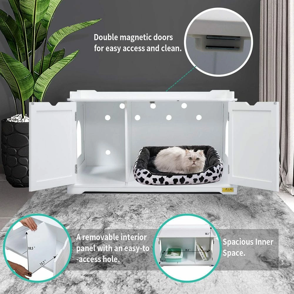 - Spacious inner with partition panel and back vents: this cat washroom bench with a removable partition panel provides a spacious inner (35.2 in. L x 16.1 in. W x 18.5 in. H) to house a standard litter box (best from 4 l to 15 l) while creating an independent space to store cat food, scoops, trash bags and other supplies, 9 pre-cut holes on the back ensure the inner dry with excellent air circulation