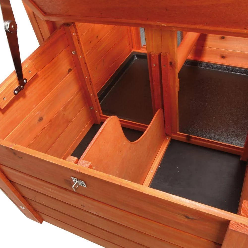 - Hinged roofs with locking arms opens over sleeping house and nesting boxes