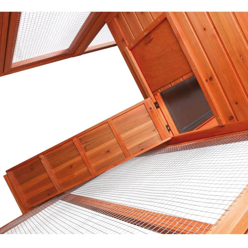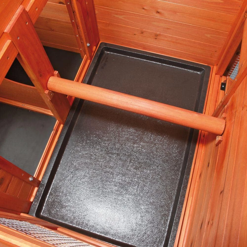 Raising chickens can be a fun and rewarding experience for any backyard farmer. They produce nutritious eggs, as well as organic fertilizer and are low-cost pets to maintain. Because chickens need room to roam and stretch their wings while still feeling safe, TRIXIE’s Chicken Coop with Outdoor Run is ideal for these lively companions. The traditional design allows your flock to roam inside and outside, upstairs and downstairs, in the sun or in the shade for ideal comfort. Solid wood construction, galvanized metal, composite asphalt shingles and a weatherproof finish means this coop will endure years of use with very little maintenance.