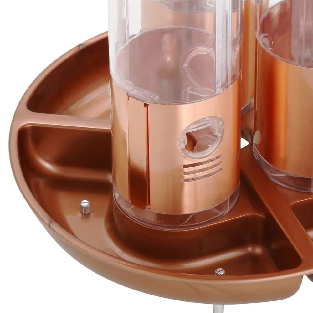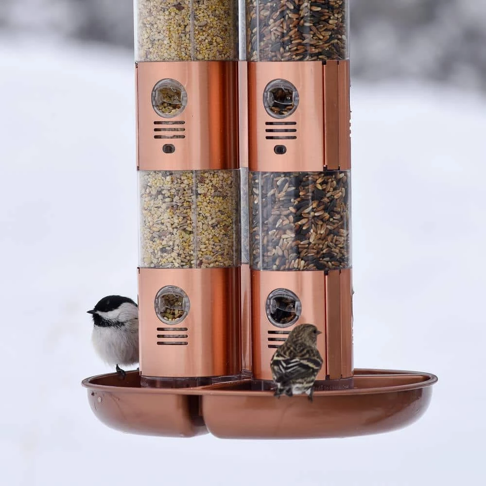 Make it easy to identify the different species of birds in your neighborhood with this Perky-Pet Copper Finish Triple Tube Bird Feeder. It’s designed to accommodate a wide variety of birds at once and can be used with different types of feed simultaneously thanks to its three independent seed compartments. The clear tubes let the natural variations in the seed show through to attract the birds, and the copper-colored accents add to your outdoor landscaping and decor. With this unique feeder, you can easily go from serving mixed seed to Nyjer with a minor adjustment to the ports. Simply flip ports down to accommodate Nyjer or flip them up to serve sunflower seed or mixed seed. y offering more seed options, you’ll easily be able to attract a wider array of your favorite bird species to the same feeder. Plus, the 10 lb seed capacity and 12 feeding stations ensure there will be plenty of room for them all! In addition to boasting a variety of features birds love, this feeder is also eye-catching. It’s a bird feeder and piece of stunning decor all in one!