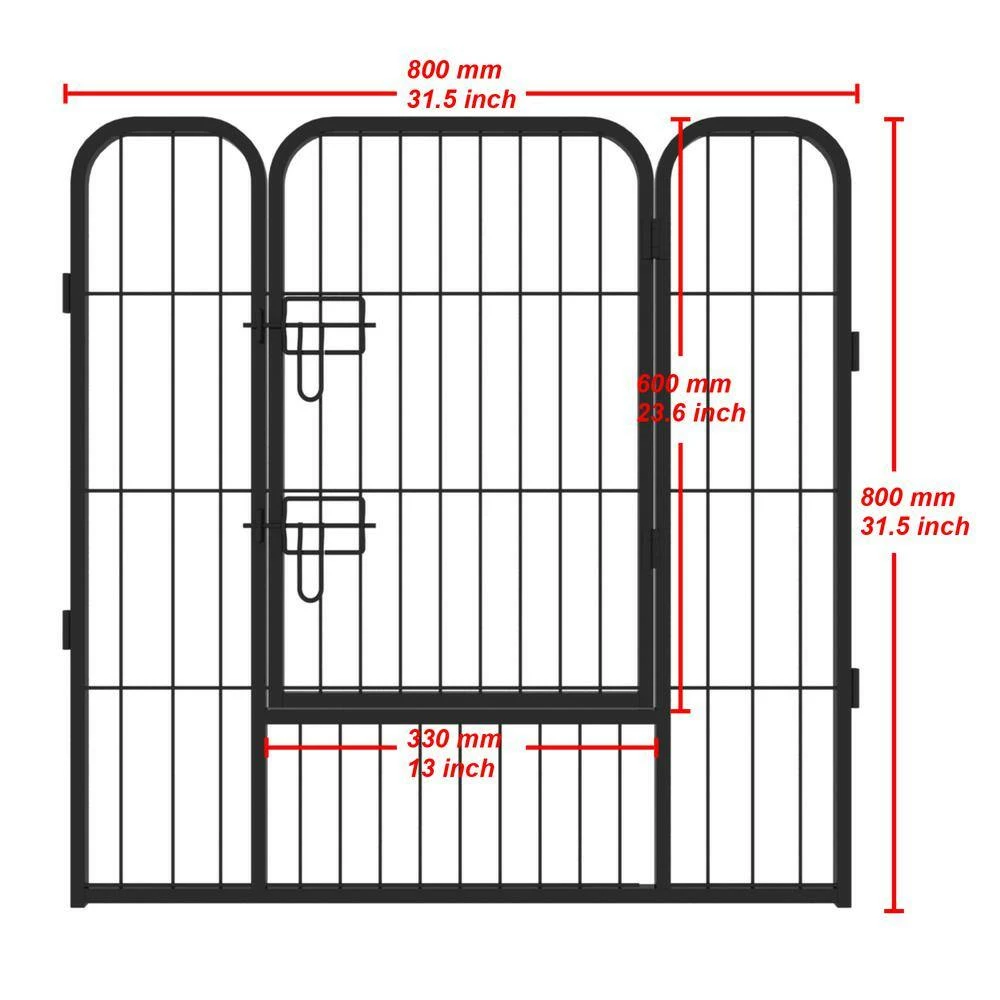 - l Specifications: our pet playpen includes 16-panels which are made of iron tubes, dimension for each panel: 31.5 in. x 31.5 in. (W x H ), dimension for each Door: 23.6 in. x 13 in. (H x W)