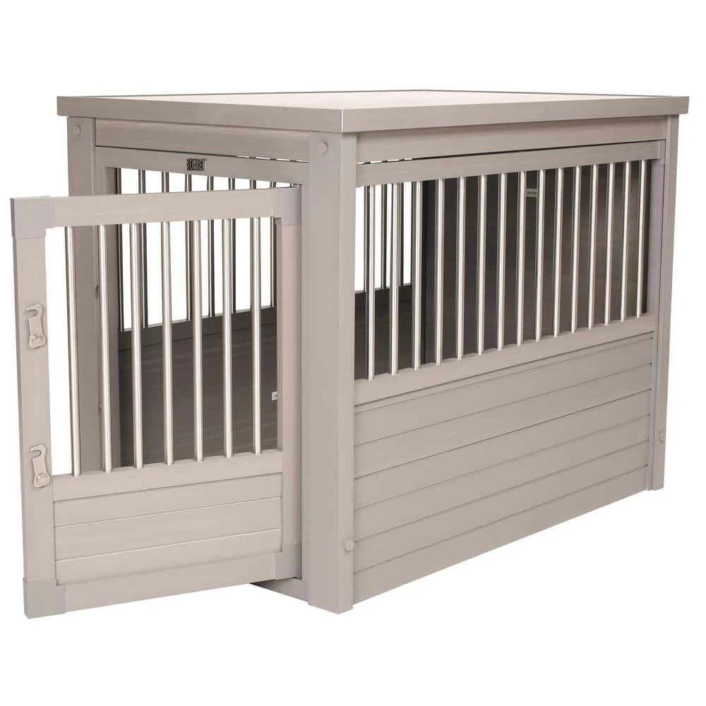 This ECOFLEX Dog Crate End Table is the perfect place for your pet when they are indoors. This ECOFLEX Crate End Table can easily do double duty in many houses where it can serve as an end table in the family room, bedroom or living room. Made of ECOFLEX material. ECOFLEX is a proprietary formula that incorporates reclaimed wood and plastic into the material that allows the product to be eco-friendly and a great value as it will outlast most other products. Designed for this use and carries an unprecedented one (1) year manufacturer warranty. Can be painted to coordinate with your other furnishings and inspire your pet style. Removable table top for easy cleaning. Color will never fade. Front door latches securely and cannot be accidentally opened. Small and Medium crates have one secure latch. Large and Extra Large crates have two secure latches. Crates are made for dogs that are familiar with crates and are less likely to chew. Spindles made of stainless steel tubing. Please note that any crate that isn’t 100% wire or metal has the ability to be chewed. This ECOFLEX Dog Crate melds form and function into a crate that can double as a piece of your home decor. Available in four sizes. Small for dogs up to 20 lbs. Medium for dogs up to 50 lbs. Large for dogs up to 80 lbs. X-Large for dogs up to 100 lbs. This product may not be a good fit for dogs that suffer from anxiety.