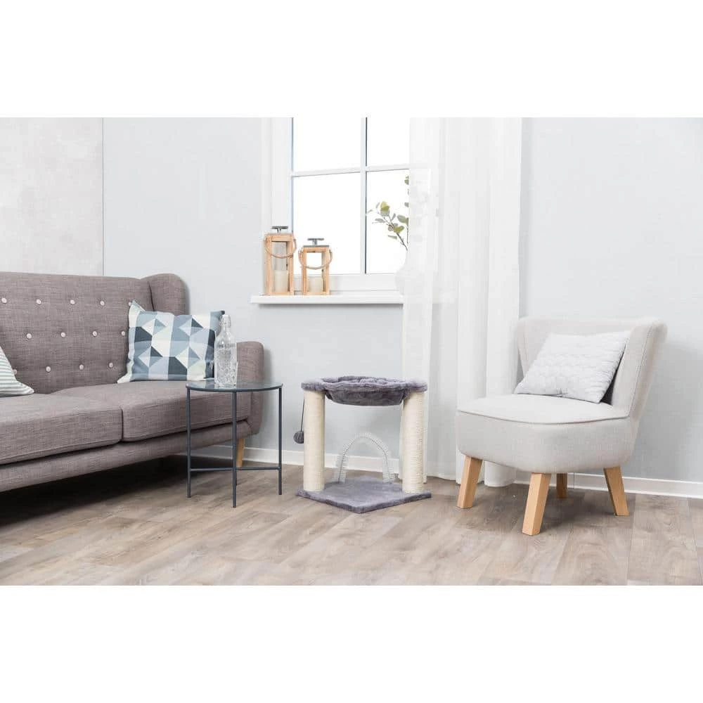 An endless source of fun, your little furry friend will spend hours interacting with TRIXIEs Baza Scratching Post with Hammock and Grooming Brush. Cats have a natural impulse to sharpen and condition their nails through scratching and removing dead layers generally following their instincts. By providing an outlet for these compulsions, youll save yourself from potential property damage, and keep your kitty happy and healthy at the same time. Featuring a naturally fibrous construction, your cat will take great joy in clawing the rope pillars and relaxing with a birds eye view in their own personal spot. A sense of privacy coupled with satisfying scratch-ability make this design an instant favorite. Constructed with natural sisal fiber, plush carpeting, and sturdy chipboard, this product offers long-lasting quality and durability. Dont have time to groom your cat, then you will love the added feature of the arched scratching brush to massage, diminish shedding and overall groom your best friend.