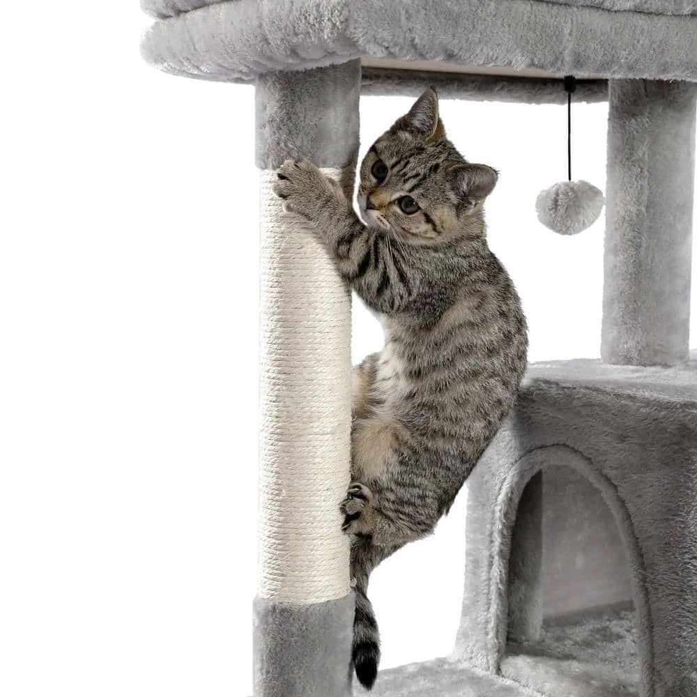 This Plush Sisal Scratcher Cat Tree can meet this need and it can accommodate 3-4 cats to have fun at a time. The cat tree condo is constructed of innocuous particle board, natural sisal and skin-friendly soft plush fabric, offering your cats a healthy and comfy touch in their tower.