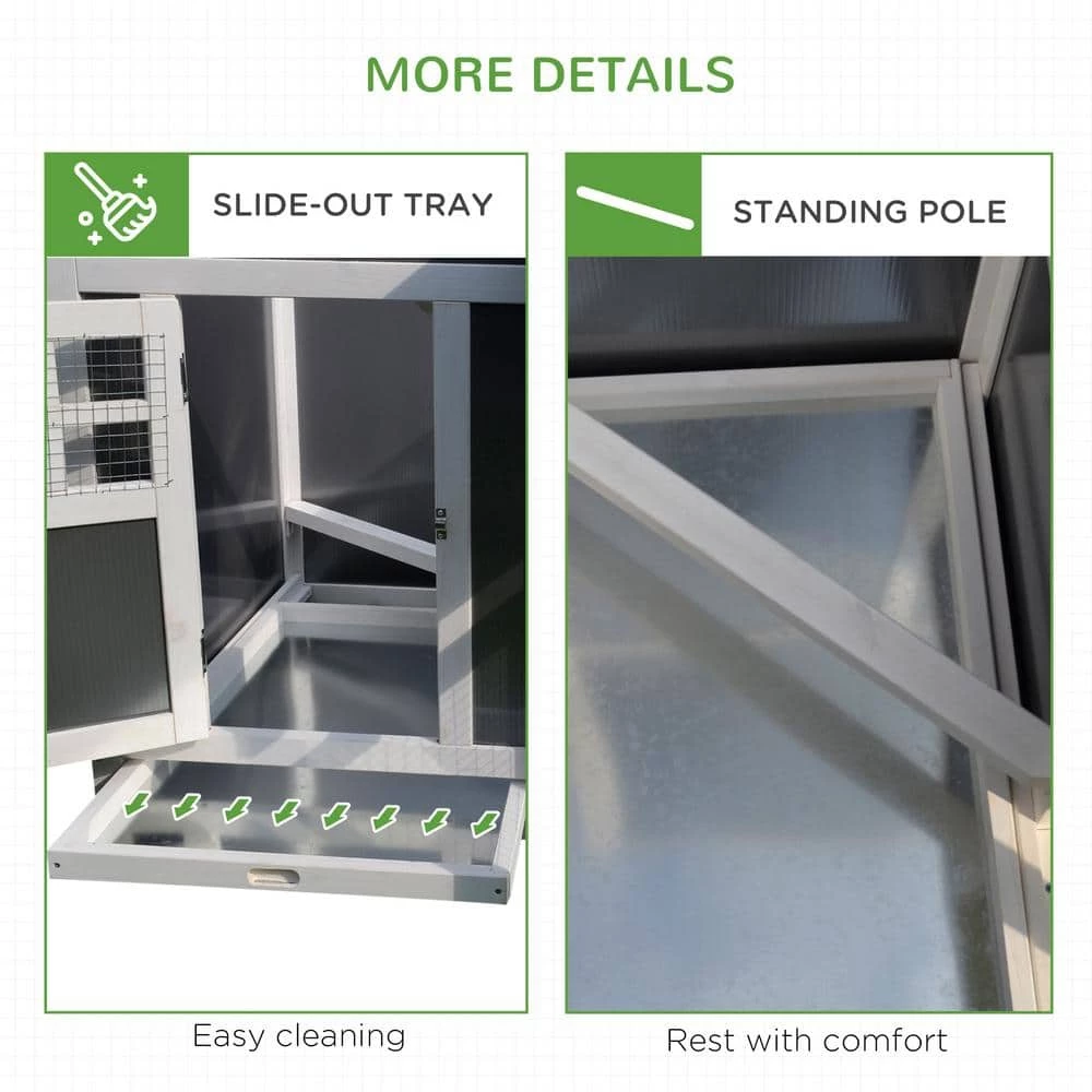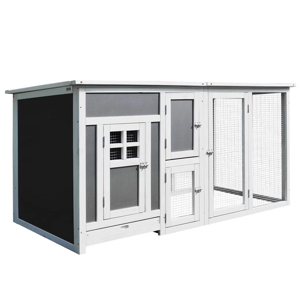 Give your furry or feathered friends a comfortable living space from PawHut. Our wooden chicken coop is the perfect mix of safety and freedom that offers all the comforts of home. The cozy indoor nesting box and spacious courtyard space offer plenty of room for daily animal activities. Lockable front-facing openings provide easy access for cleaning, feeding and other routine tasks. The main area features a waterproof hinged roof with polycarbonate panels that provides proper air circulation to the structure. with this cozy yet spacious rabbit hutch from PawHut, your animals will be living the dream.
