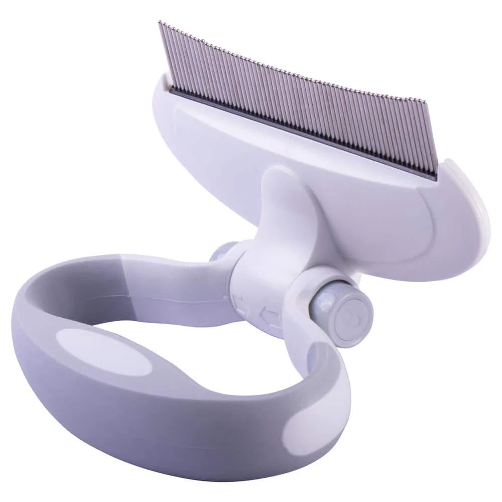 The PET LIFE ‘Gyrater’ Travel Swivel Curved Pet Pin Comb features a Built-in customizable rotating handle hinge that both swivels and locks into place at the press of a button to your desired handle setting. This Comb offers both a Palm and Knuckle Handle grip options and features a contoured inner grip with a Rubber-like TPR material for added comfort while combing. Designed to place less Stress on the hands and wrists during usage. The Comb features specially engineered Stainless Steel curved blades that effectively capture more hair and remove stubborn Knots and Tangles. The fine tooth blades are long enough to get into both their Top Coat and Undercoat Layers and the perfect length for both Dog and Cat Short Hair and Long Hair Breeds. Small and Compact make it perfect for Travel. SIZING DIMENSIONS: 4.72 in. L x 2.76 in. W x 1.18 in. H.