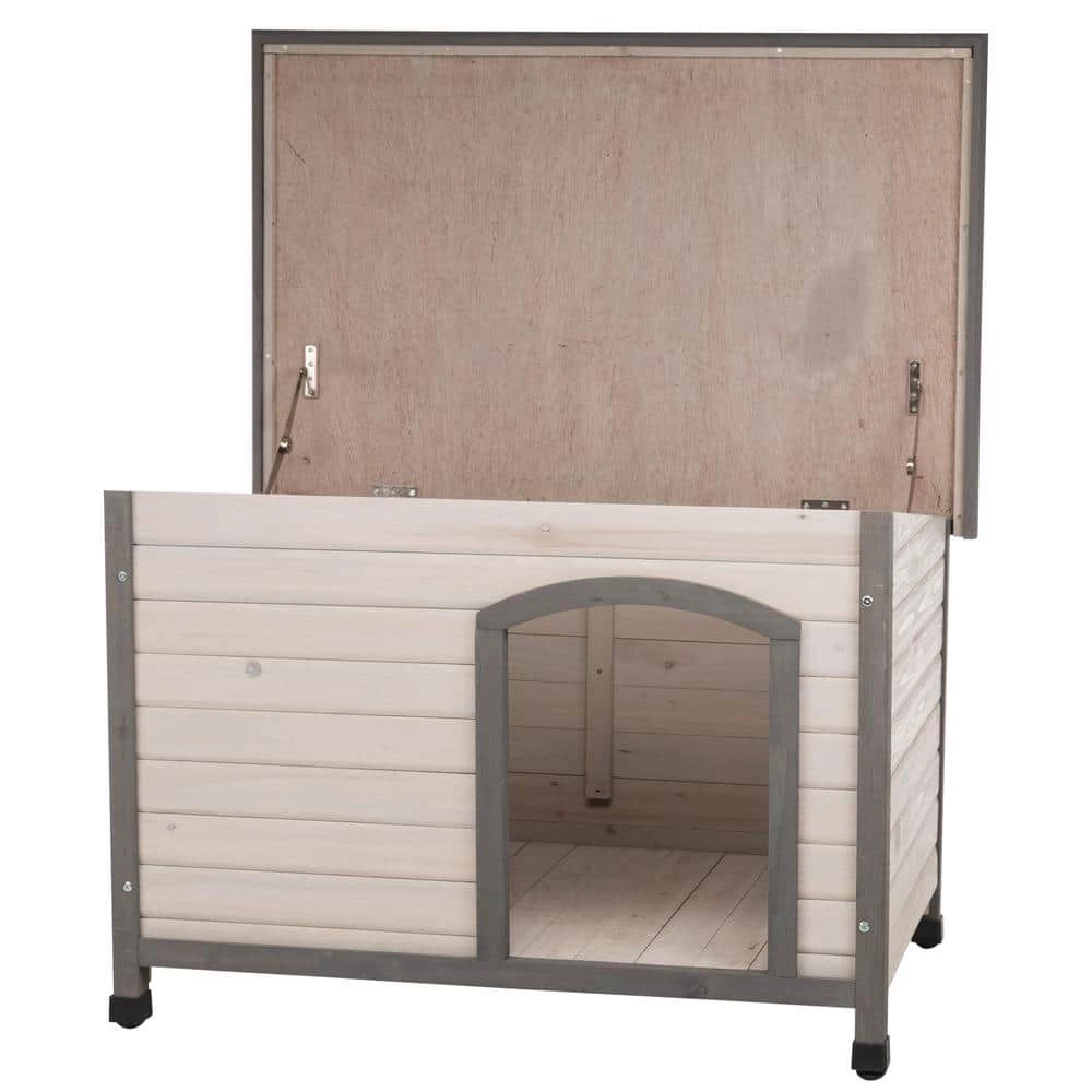 - The hinged roof with a locking arm allows for easy access to clean and organize your dog’s home