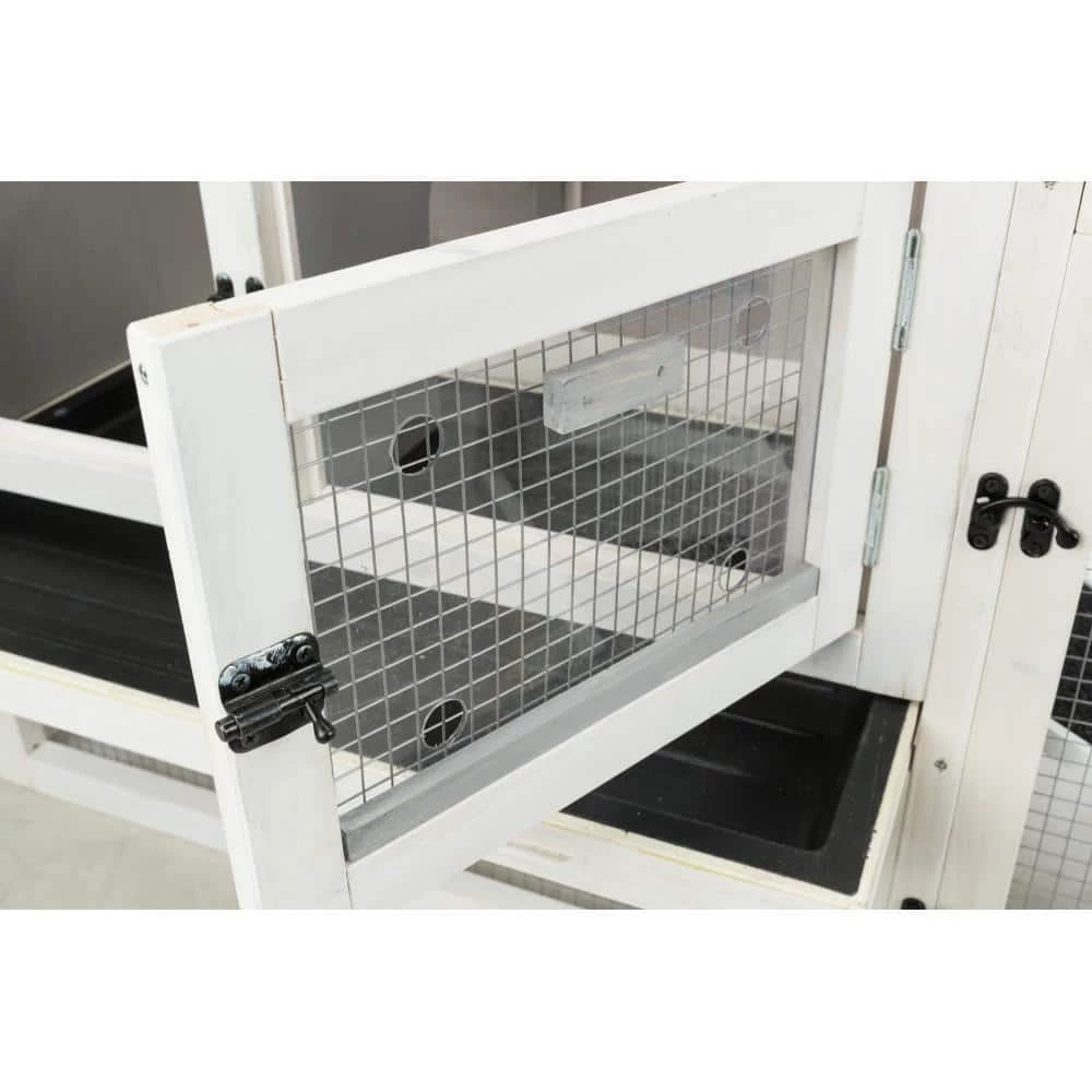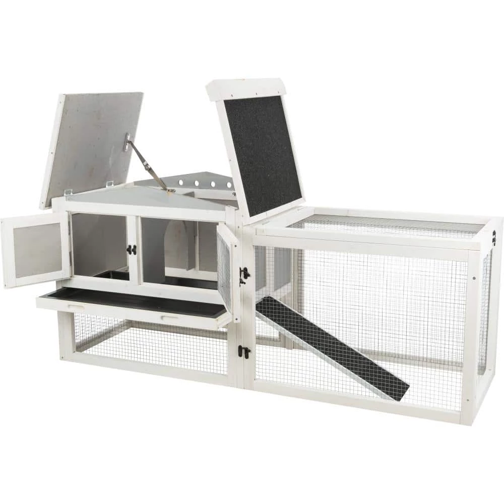 TRIXIE’s Insulated Rabbit Hutch with Outdoor Run XS is ideal for single and smaller breed rabbits, as well as guinea pigs. Outer walls, roof and tub include foam insulation, plus windows include removeable plastic panes. The 2-Story design has a retreat area on the upper level. It has both a hatch and sliding door to give owners the option to restrict access as needed. The non-slip ramp allows your pets to roam inside and outside, upstairs and downstairs, in the sun or in the shade for ideal comfort. The run opens from above and is easily attached/removed using metal hooks. The hinged roof with locking arm opens on one side. For easy maintenance, we’ve included a pull-out metal tray and a hinged roof with locking arm that can be opened on one side. Solid wood construction, painted finish and our finest materials mean this hutch will endure years of use with very little maintenance. Quick and easy assembly. 1-year warranty. Color: Gray. Dimensions (Inch): 61 in. x 21 in. x 28 in., hutch 30 in. x 21 in. x 28 in., run 31 in. x 21 in. x 23 in., mesh door 13 in. x 9 in., wood door 10 in. x 9 in., run opening 27 in. x 19 in., mesh gauge 0.12 in. x 0.07 in., mesh spacing 0.5. Mesh coating: powder-coated metal lattice. Weight: 42 lbs. Note: Water bottle and bowl not included.
