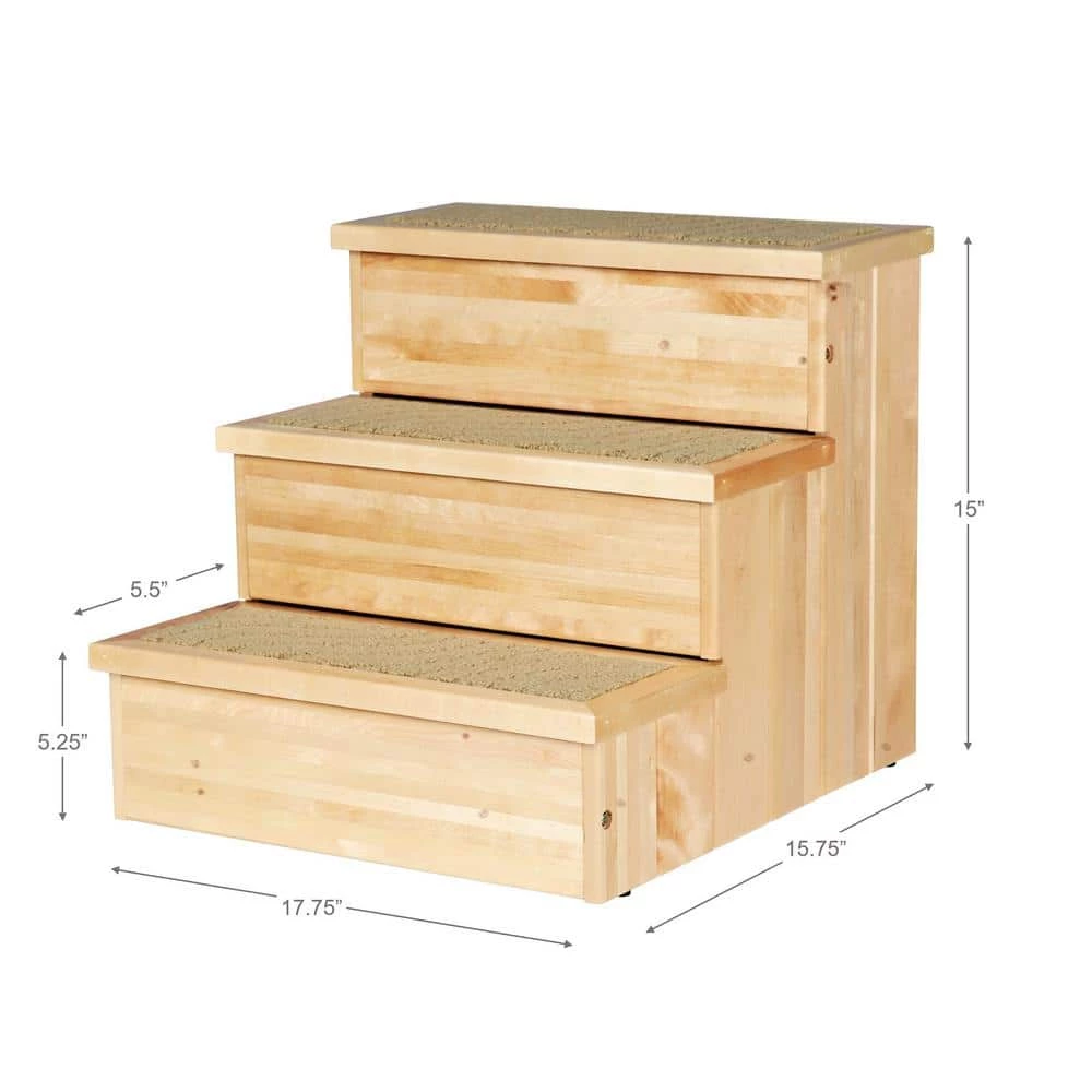 Designed specifically for small, elderly, or sick pets weighing less than 50 lbs. TRIXIE Wooden Pet Stairs make it easy for pets to get up on a bed, sofa or chair without having to jump. Stylish carpet lined steps keep pets safe from slipping, while the storage area located under each removable step provides a functional solution to storing pet toys. These steps are crafted from beautiful birch wood and coated with clear varnish.