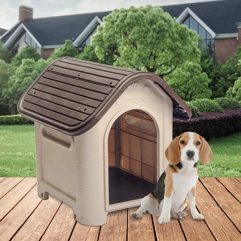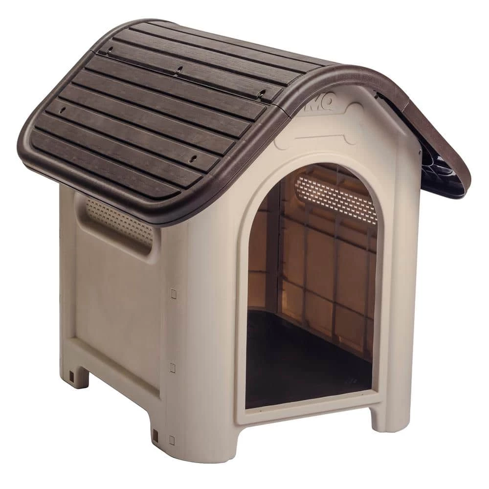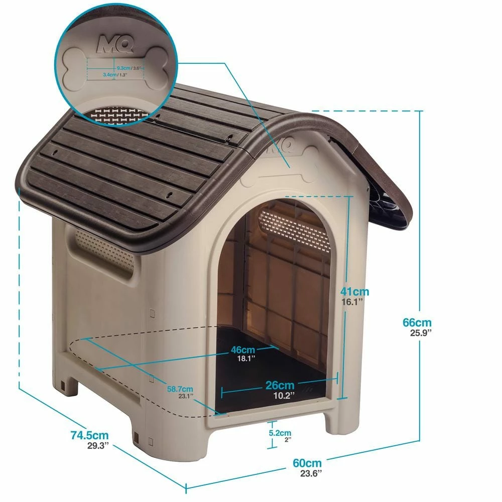 The Inval by MQ Dog House includes a matching bowl and is perfect for small/medium breeds. It’s unique floor design allows the floor to be removed for easy cleaning and interior cleaning. Both dog house and bowl areas are made of durable polypropylene resin that is moisture, rust, stain and scratch resistant. Construction also features UV protection. The roof design prevents rain or other weather elements from getting inside. Side and rear ventilation allows for maximum pet comfort. Elevated design keeps your dog off the direct ground. Accompanying bowl can be used for water or food. Both dog house and bowl are perfect for indoor or outdoor use. Overall dog house dimensions are 25.9 in. H x 23.6 in. W x 29.3 in. D. Door entrance measures 16.1 in. H x 10.2 in. W. Hardware is included and easy assembly is required. Manufacturer 1-year limited warranty.