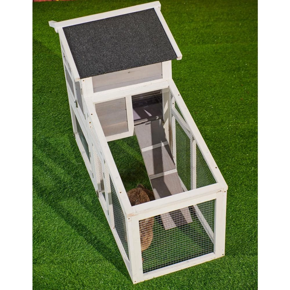 - Raised and closed cage offers a warmer and safer for pets and poultries and prevents predators from reaching into the enclosure, the hutch with a pitched roof effectively protects them from irritating sunlight and rain to always keep a safe and comfortable shelter for pets,