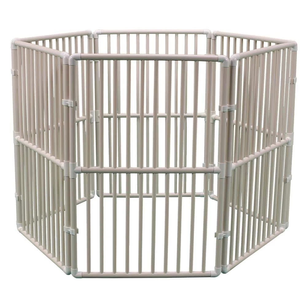 The Cardinal Gates Portable Pet Pen (model PPP) is the ideal for giving your family pet a sizeable play enclosure outdoors while remaining highly configurable and portable. Consisting of 6 panels measuring 2 ft. x 3 ft. and 12 connecting clips, there is minimal assembly required: simply remove all panels from the box and secure the panels to each other using 2 of the included plastic clips between each panel. Additional panels and clips available to create a larger pen (model PPPX, sold separately). This pet pen is constructed out of sturdy yet light-weight PVC, making it completely weatherproof, and has a total weight of 24 lbs. Multiple configurations are possible, and panels can be used in either a vertical or horizontal orientation, creating a taller pen for larger dogs and jumpers or a shorter pen for small pets. The Cardinal Gates Portable Pet Pen can be folded accordion-style for quick and easy travel, allowing your pet to enjoy spending time with you wherever you are. NOTE: This pen is intended for pet use only and is NOT for child use.