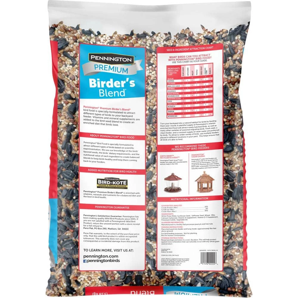 Pennington Premium Birder’s Seed Blend Bird Food is specially formulated to attract different types of birds to your backyard feeder. Made from 100% real fruit, nuts, seeds, and grains, which include black oil sunflower and safflower seed. Vitamins and mineral supplements are added to the bird seed and feed blend to create an enriched diet that birds love.