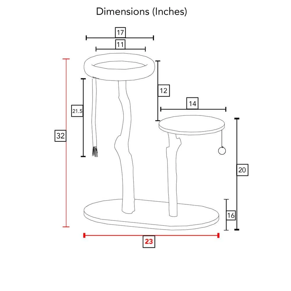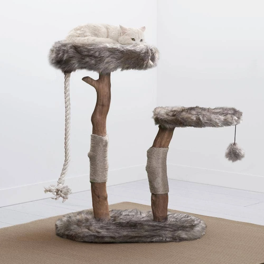 Naps are important but so is fun time, and there’s no reason a cat tree tower can’t provide both! Equally great for single or multi-cat households, the Rizzo comes with dual rest spots including a lower level plush perch and a luxuriously fluffy cat bed just one foot higher on the upper level, but it’s the bells and whistles of this gem that make it a feline favorite. Made of real tree branches, properly treated for pet safety and long term use indoors, this modern wood cat tree packs a playful punch with two sturdy scratching posts, a pom-pom toy, and a free-hanging 21.5-inch rope for irresistible fun. (By the way, don’t worry about using our valuable natural resources: We plant a new tree for every cat tree sold!)