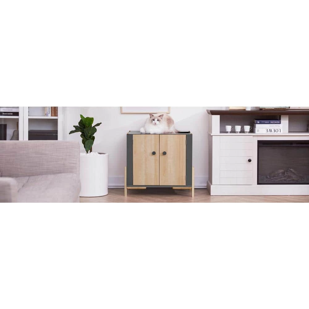 - Multi-functional: this large 2 tone double door cabinet functions as both a cat litter box enclosure and a beautiful end table
