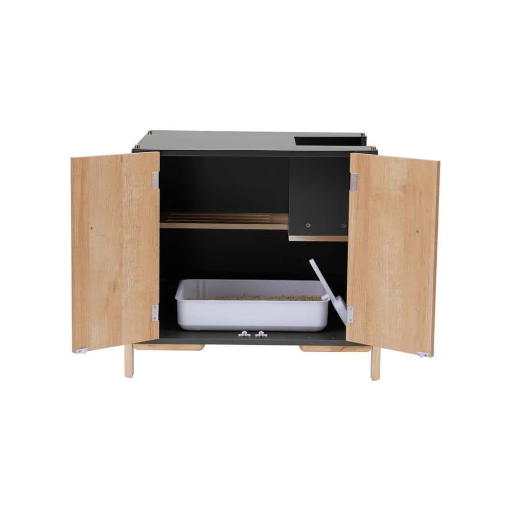 - Included: contemporary mid-century-inspired litter box enclosure with double doors, top side entrance, elevated legs and slatted walkway