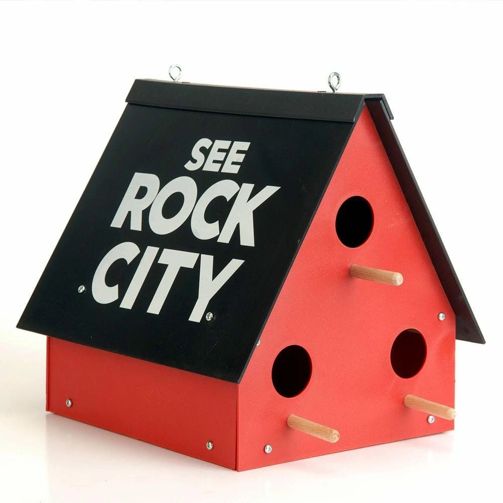 For decades Rock City Gardens’ legacy of barn, billboard and birdhouse advertising has directed motorists up Lookout Mountain to “See Rock City.” In 1936, Garnet Carter gave Clark Byers a truck, some paint and a mission: to paint SEE ROCK CITY on every barn he could find. Byers built a miniature barn intending to sell it as a mailbox, but when the U.S. Postal Service wouldn’t allow this, he made it into a birdhouse instead. They were soon found outside homes and businesses nationwide, even overseas. See Rock City Birdhouses make the perfect cozy home for a wide variety of birds including the Carolina Wren, Tufted Titmouse, Carolina Chickadee, House Sparrow and Eastern Bluebirds. It will also attract the famous Purple Martin when mounted on a pole in open areas. The official See Rock City Birdhouse is easy to assemble and will make the perfect addition to your home and garden.
