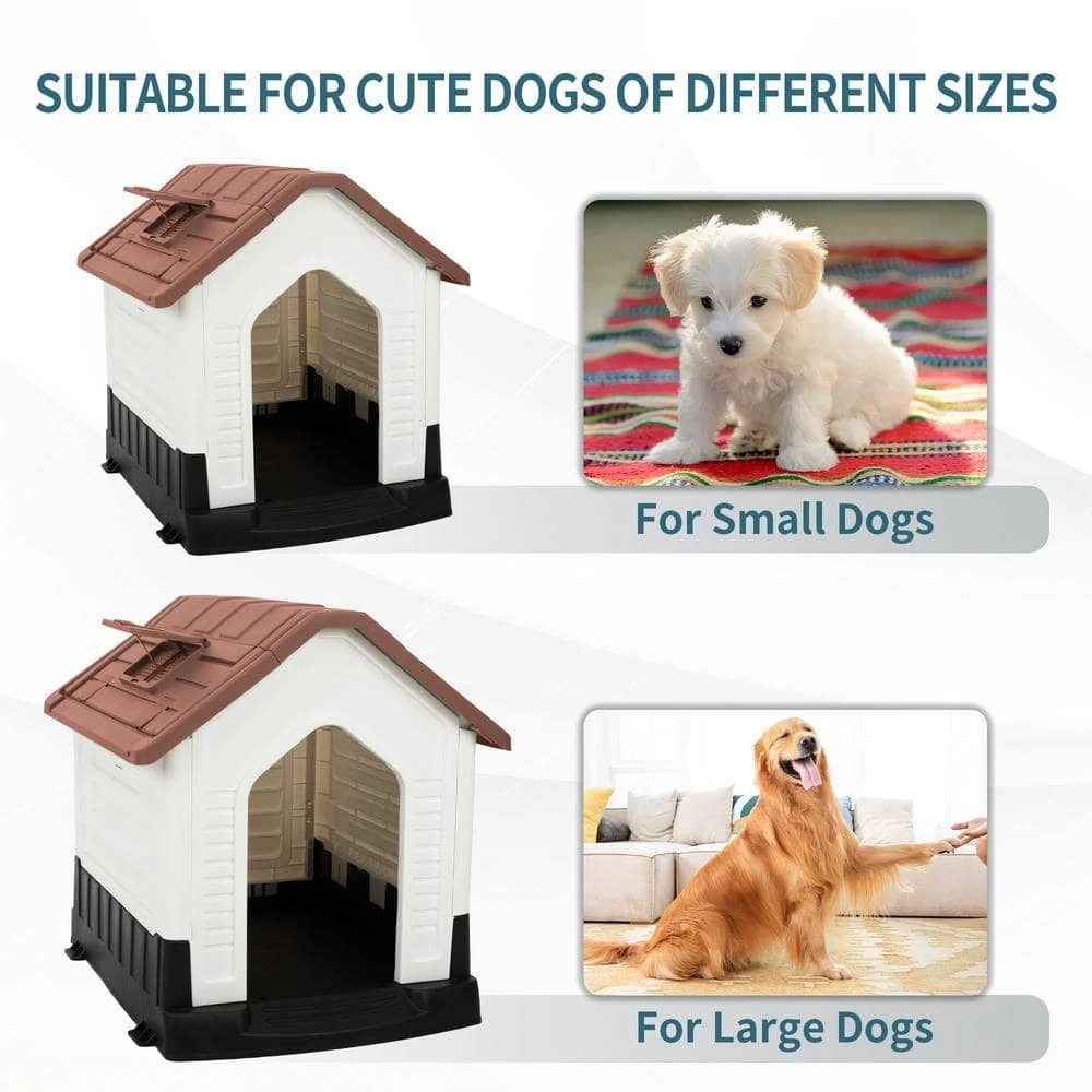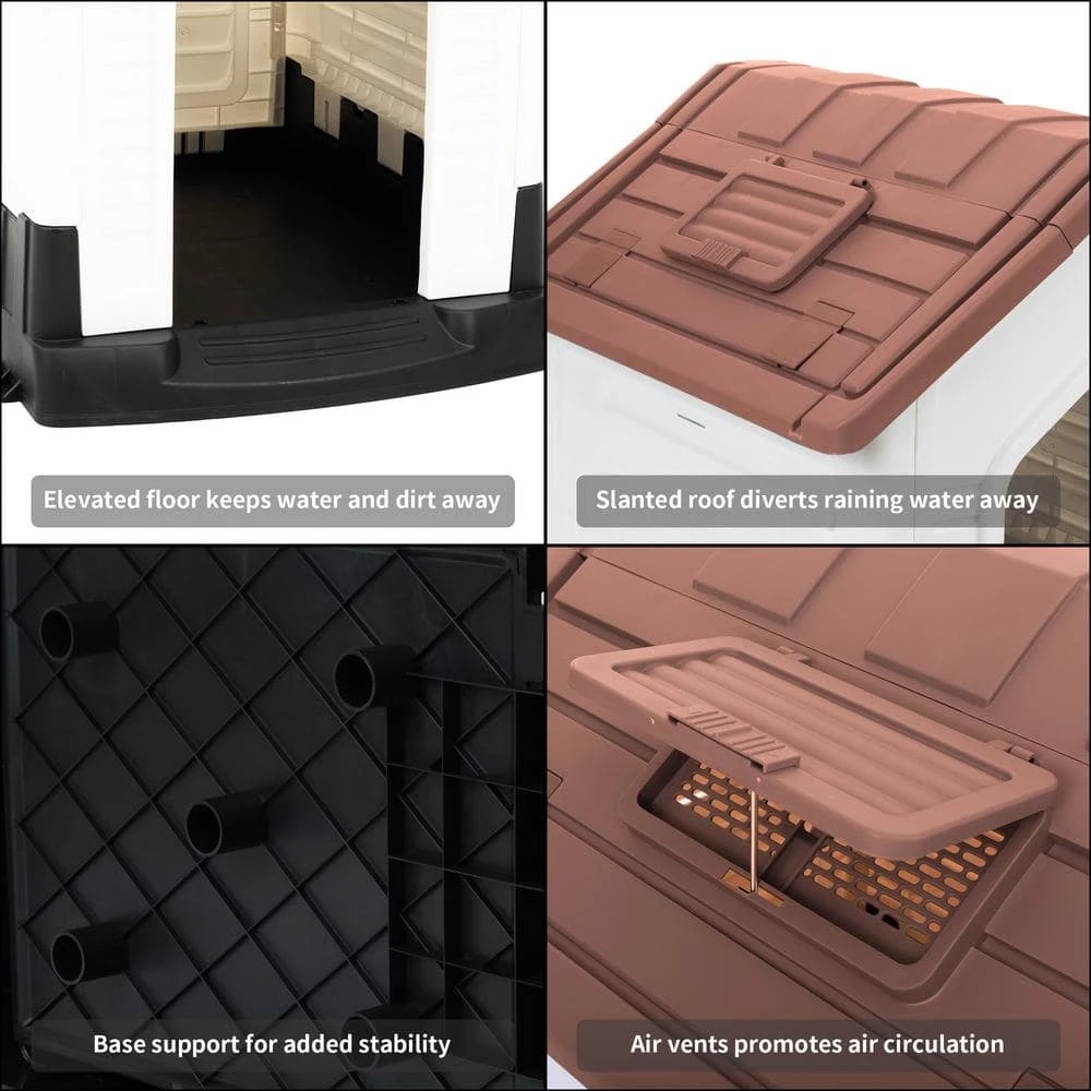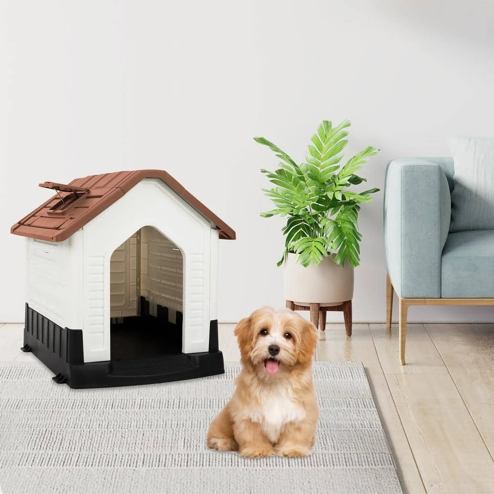This waterproof Plastic Dog House is a simple, easy-assembly pet house that can work for both indoor and outdoor use. Molded plastic will keep out the elements, while a vented roof will keep air circulating inside. You can also rinse it clean and set it up in-minutes, no tools required.