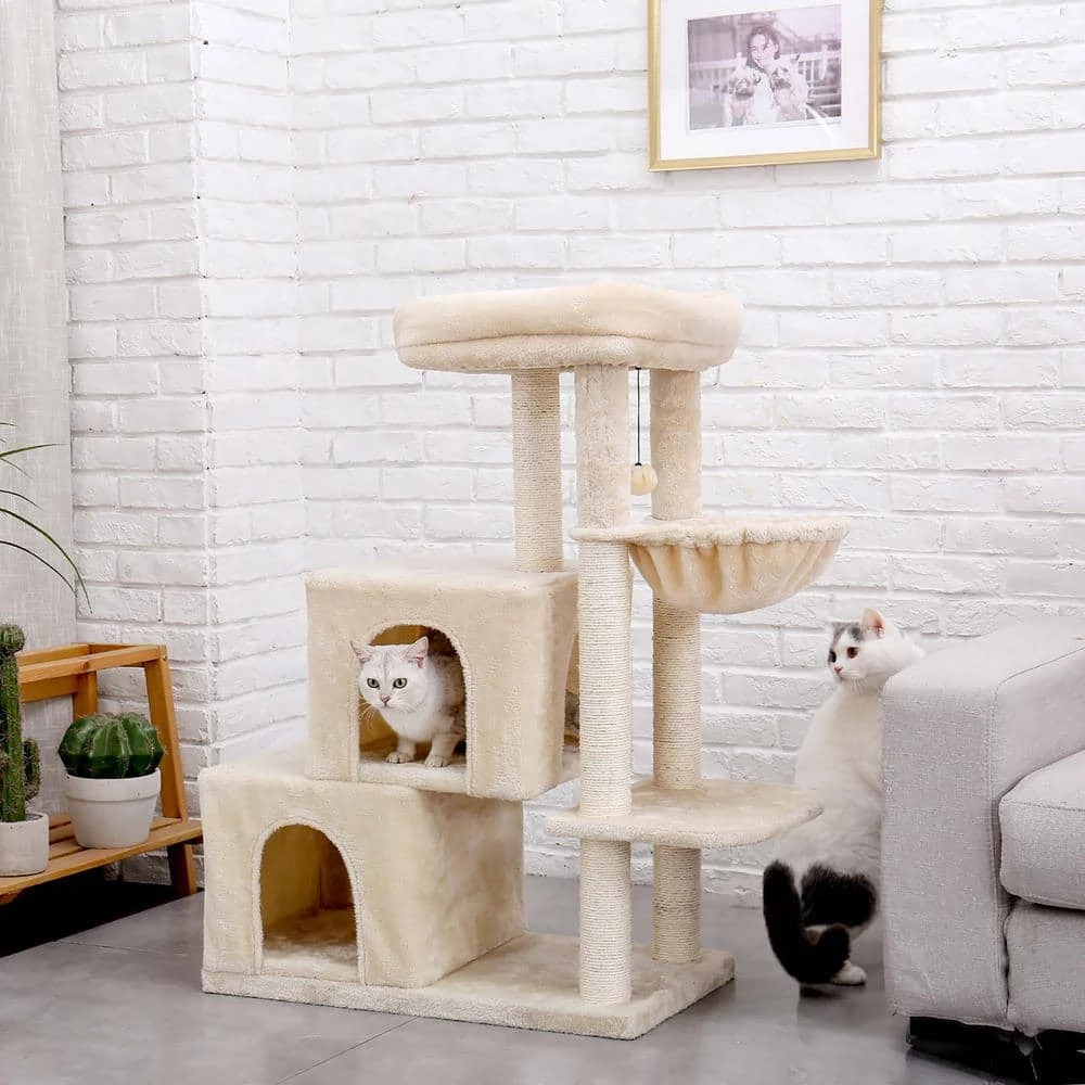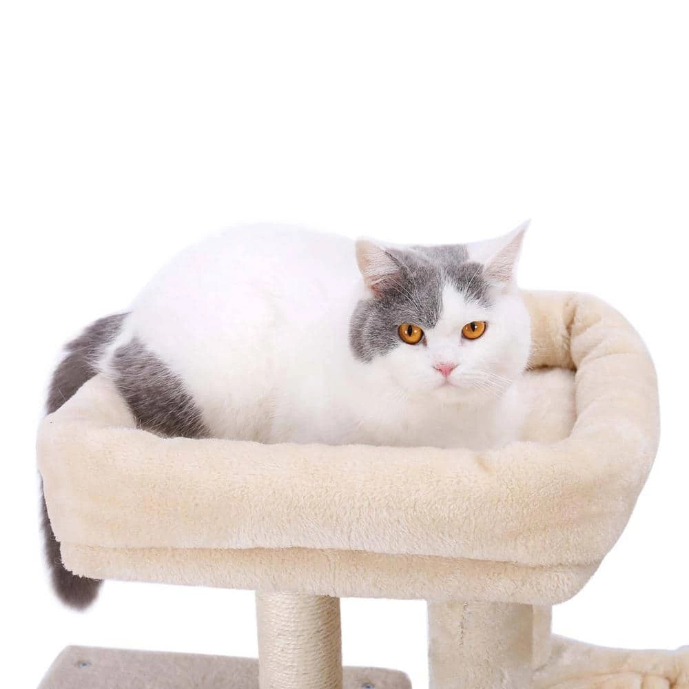 This cat tree features 2 condos, 1 top perch, 1 hammock and 1 toy. It has plenty of room for your cats to play and lounge. with a post covered in natural sisal rope to scratch on, your cats will leave your expensive furniture alone. Easy to assemble with step by step instruction and tools include. Aren’t You Still in The Mood. – This cat tree is ideal for all kinds of cats. Space-save size design with big condo can fit perfectly to all cats. It’s the perfect compact playground for your light-footed house tiger. Sharpening their claws, lying around, playing and hiding. every cat has their own favorite activity on our scratching tree.