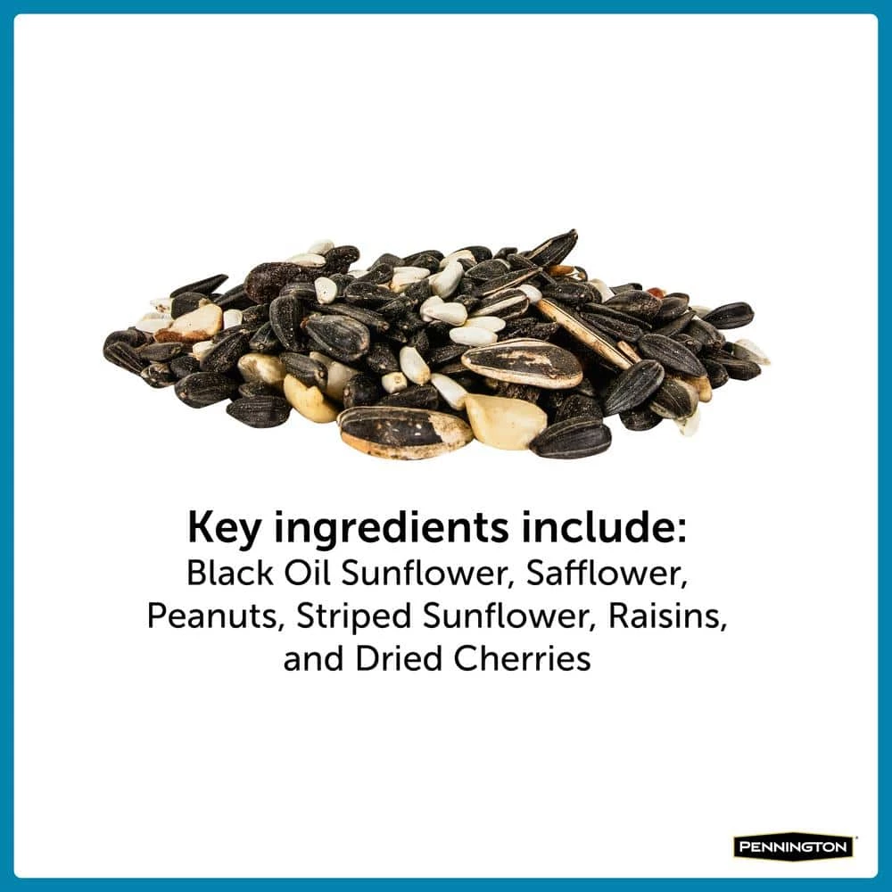 - Ingredients include black oil sunflower, safflower seed, peanuts, striped sunflower, raisins and dried cherries