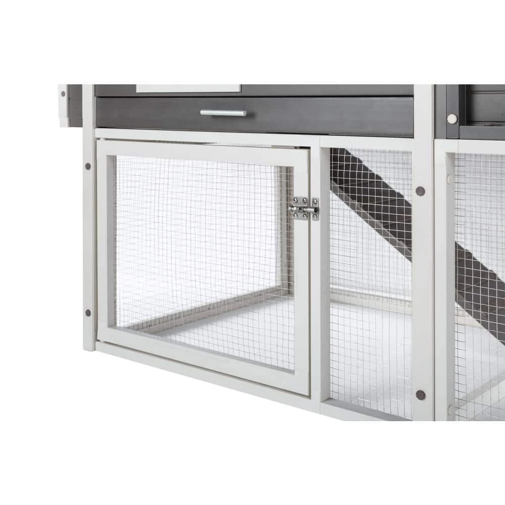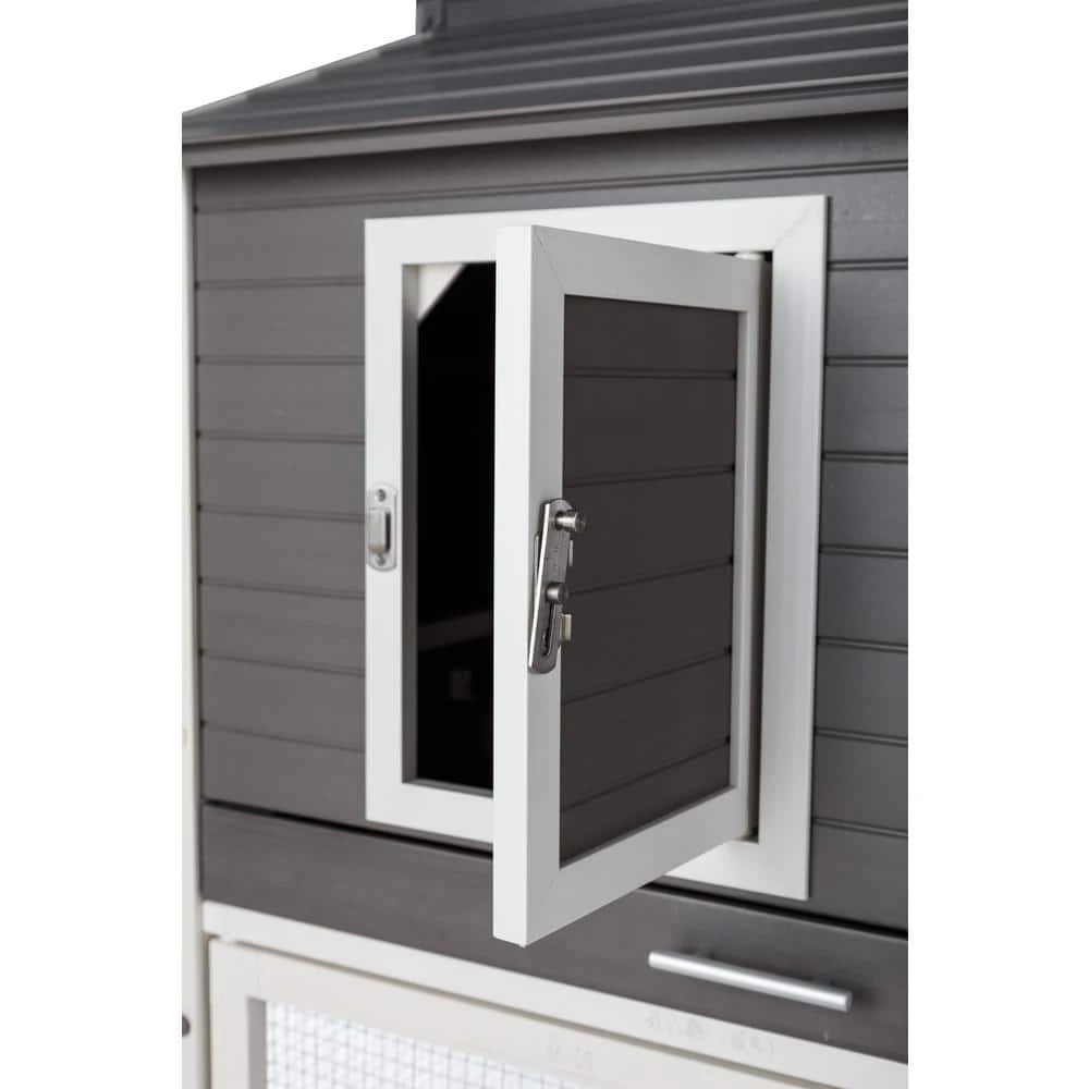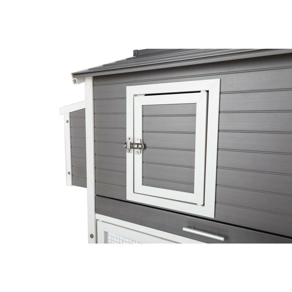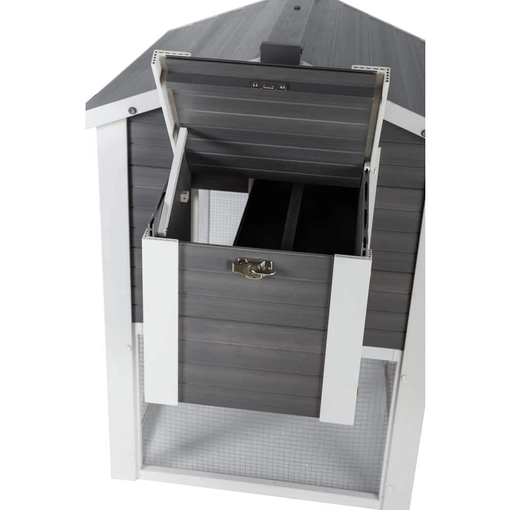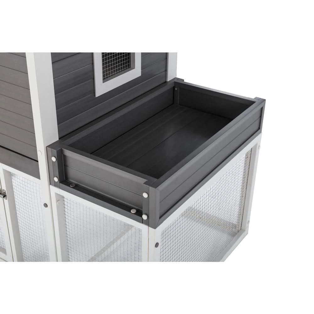 The ECOFLEX Urban Farm Garden Chicken Coop is made with ECOFLEX, a proprietary composite blend of recycled polymers and reclaimed wood fiber by-products. The ECOFLEX material is non-toxic, eco-friendly and impervious to moisture and odor, making it the perfect material to keep your flock happy and healthy. All New Age Pet outdoor products are backed by an unrivaled 10-year limited manufacturer warranty. This coop features 2 levels of living space, a single-compartment nesting box with hinged lid for easy egg collecting, 2 roosting bars and an easy to clean, ECOFLEX pull out tray. 2, 1 on the coop, 1 on the pen. The top level has 1-door opening to the main coop and an opening to allows access to the ramp to the ground level pen, which is open to the ground, so your flock has access to a shaded and grassy area. The lower pen area has an entry door secured with predator resistant latch and is constructed using NeveRust stainless steel wire mesh for years of maintenance free use. New Age Pet products are easy to assemble, easy to clean and easy to LOVE Overall dimensions: 60.2 in. L x 31.6 in. W x 43.3 in. H Garden box dimensions: 13.4 in. L x 24.7 in. W x 3.7 in. H.