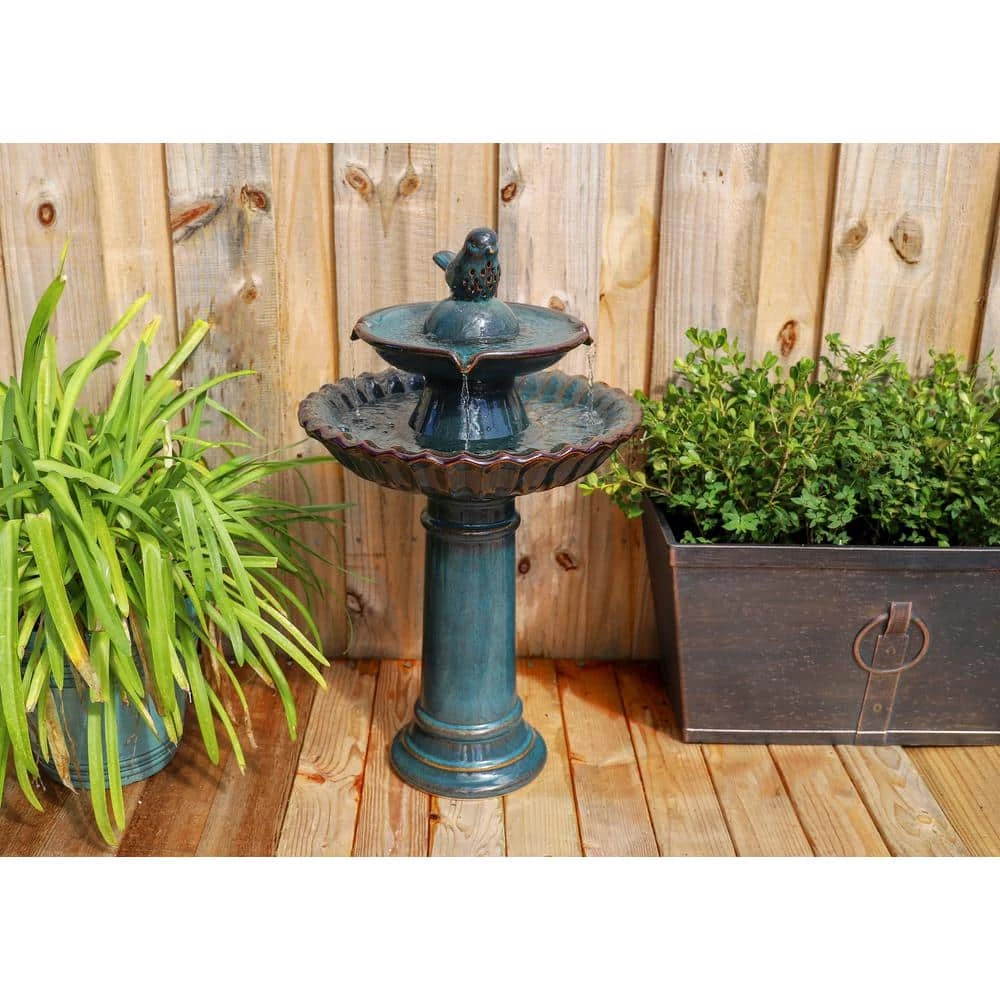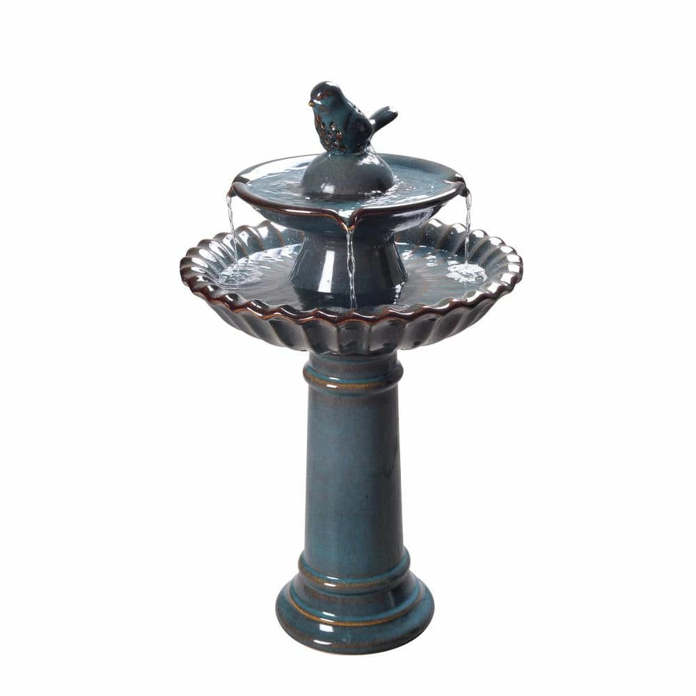 A little birdy told me you were looking for the perfect water feature for your outdoor living space. A traditional ceramic birdbath style fountain provides an inviting accent in your quaint country cottage garden while gently circulating fresh water for your feathered friends. Water bubbles from beneath the adorable glazed ceramic bird before cascading into the basin below, filling your backyard with the peaceful sound of trickling water. The durable 2-toned glazed teal adds a chic, trendy touch to the traditional profile for a look thats as fashionable and colorful as you are perfect for your rustic cottage chic decor or flowery backyard garden.