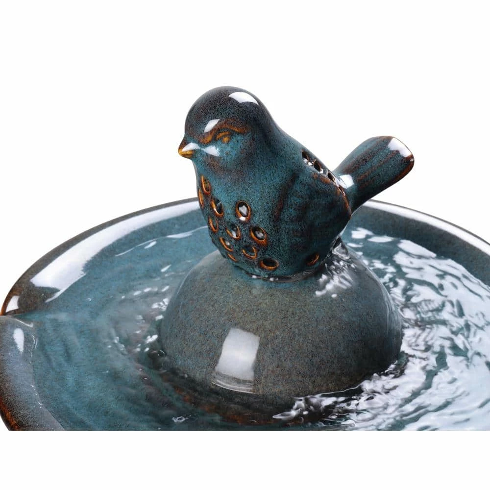 - Water bubbles from a teal glazed ceramic bird accent and spills into the basin below to circulate fresh water for winged visitors in your garden