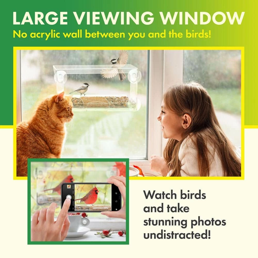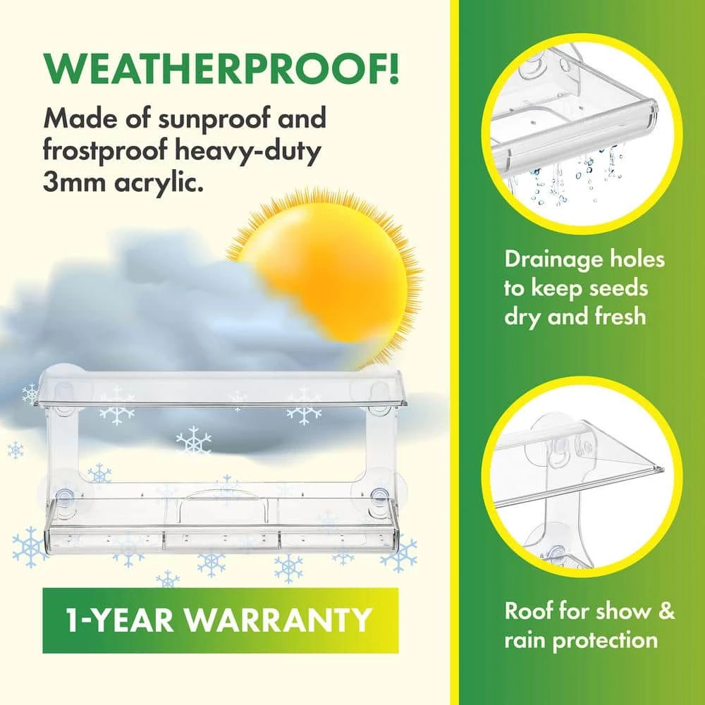 - Durable delight – rain or shine, enjoy instant access to your feathered friends, with 4-strong suction cups and heavy-duty acrylic, your feeder is weatherproof and stays put during harsh conditions