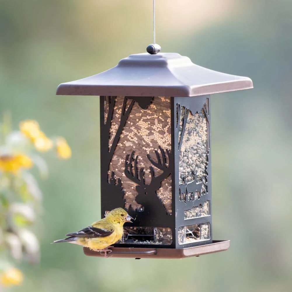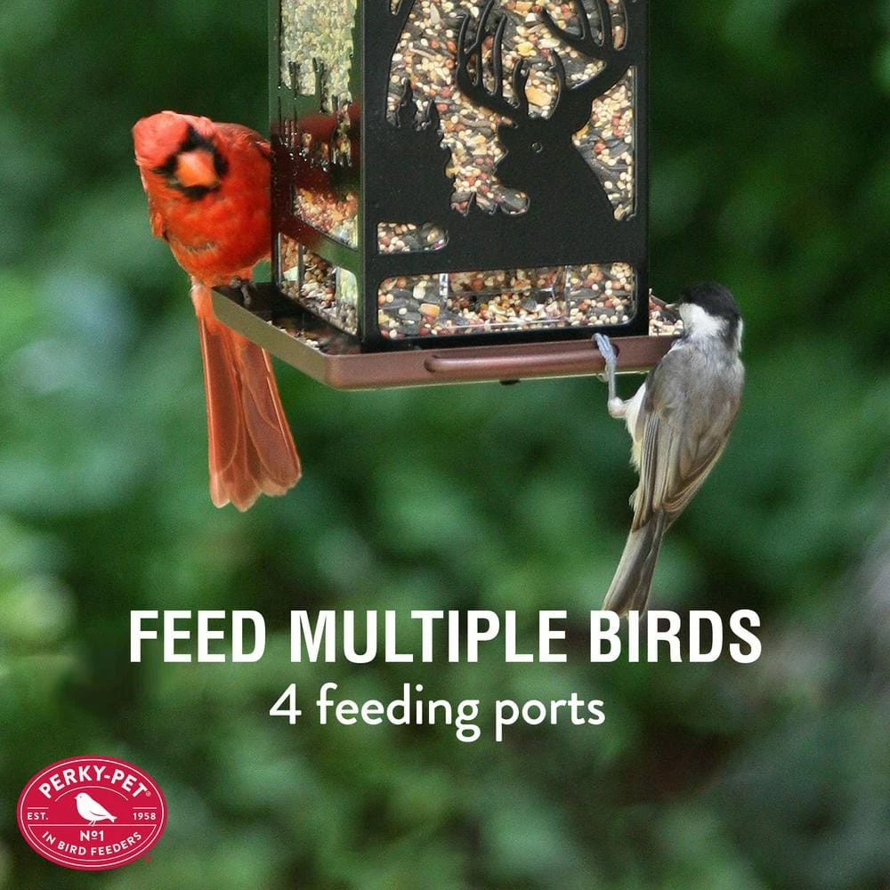 The Perky-Pet Wilderness Lantern Bird Feeder features adjustable U-shaped perches to help you attract different sized birds. The bird feeder’s Sure-Lock cap system keeps the lid secure to help prevent squirrels from stealing your seeds. The feeder also features 4 feeding stations and seed-saving drain holes for added convenience.